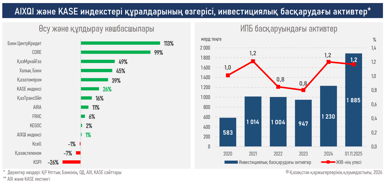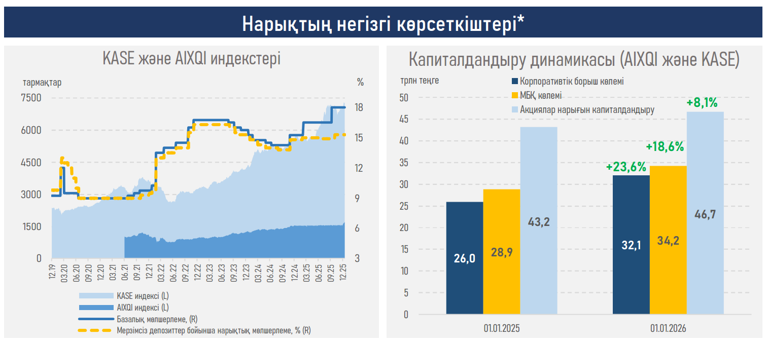 - Елдің қор индекстері 2025 жылды оң серпінмен аяқтап, жаңа тарихи ең жоғары деңгейлерге жетті: KASE индексі 26%-ға, ал AIXQI 1,3%-дық өсім көрсетті.