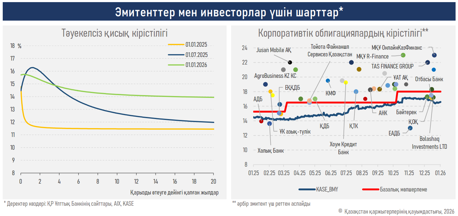 - Корпоративтік шығарылымдардың кірістілігі экономикадағы ақшаның қымбаттауының жалпы трендін көрсетті: корпоративтік облигациялар кірісінің индексі (KASE_BMY) 2025 жылы 194 б.т.-қа өсіп, жылдық 16,44%-ға жетті.