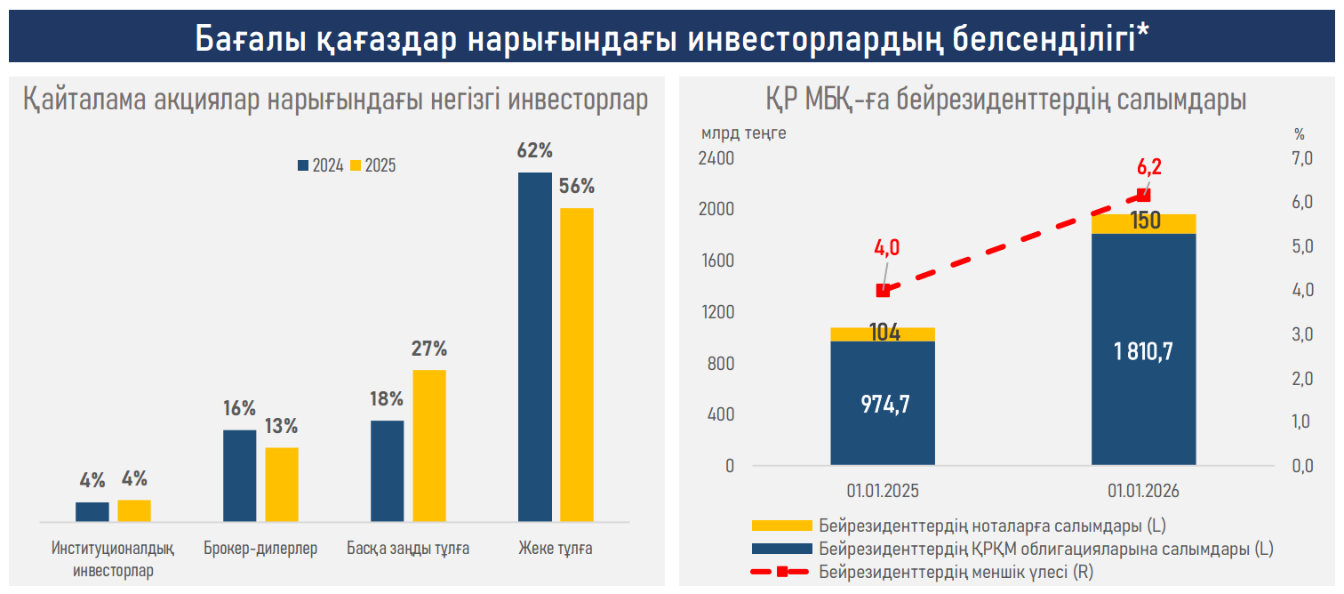 Индекстердің оң динамикасы аясында еліміздің қор нарығының капитализациясы 2025 жылдың қорытындысы бойынша 46,7 трлн теңгеге дейін (+8,1%) немесе ЖІӨ-ге шаққанда 28,9%-ға дейін өсті; инвестициялық портфельді басқарушылардың (ИПБ) басқаруындағы активтер 1,9 трлн теңгеге дейін (+53,3%) немесе ЖІӨ-ге шаққанда 1,2%-ға дейін артты.