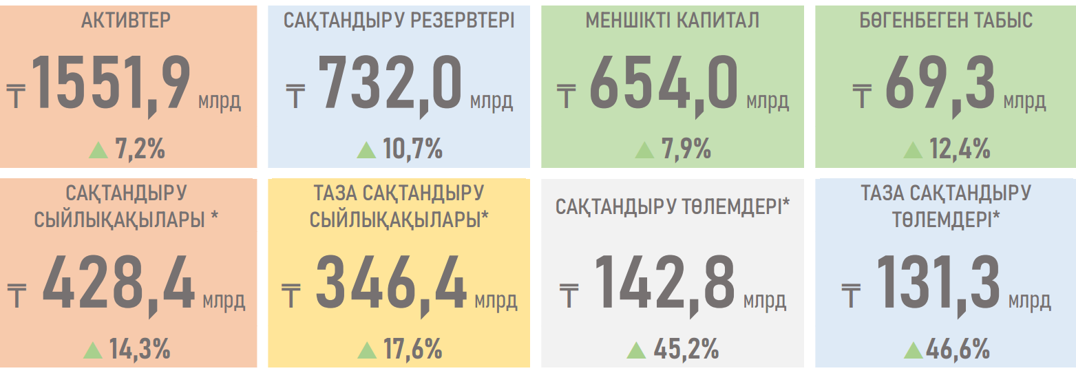 ЖСК активтері өсімінің баяулауы аясында олардың сақтандыру нарығы активтерінен үлесі бір жыл бұрынғы 51% көрсеткішіне қарсы 44,9%-ға дейін төмендеді (ӨСК активтері анағұрлым айқын өсуде). - ЖСК активтерінің құрылымында негізгі өсім қазақстандық қор нарығының және көптеген шетел алаңдарының индекстерінің өсуіне байланысты бағалы қағаздарда (+₸29 млрд немесе 2,9%) байқалады, қайта сақтандыру активтерінде (+₸23 млрд немесе 37,7%) — күтілетін ақша ағындарын ең жақсы бағалау есебінен және орналастырылған салымдарда (+8 млрд теңге немесе 15,4%) монетарлық саясат қатаңдатылғаннан кейін олардың неғұрлым жоғары мөлшерлемелер есебінен.