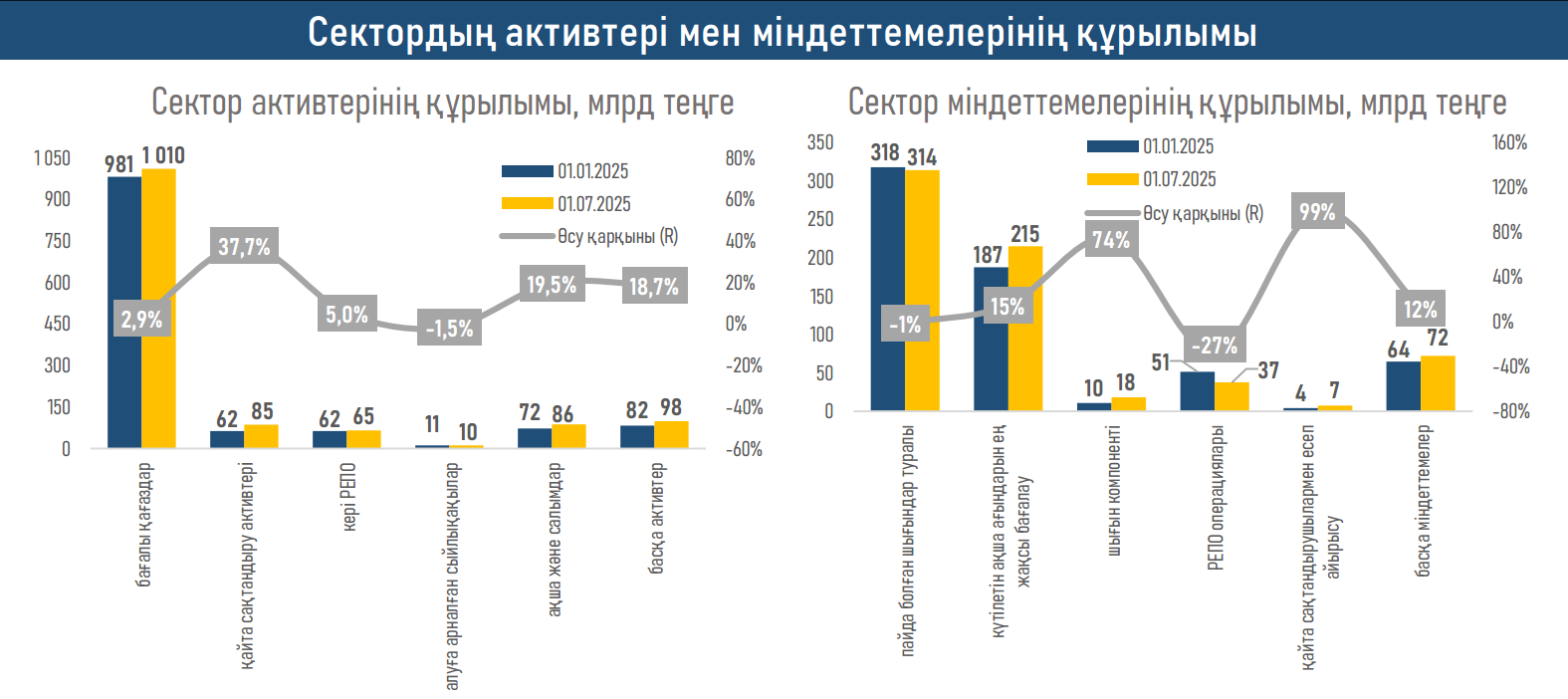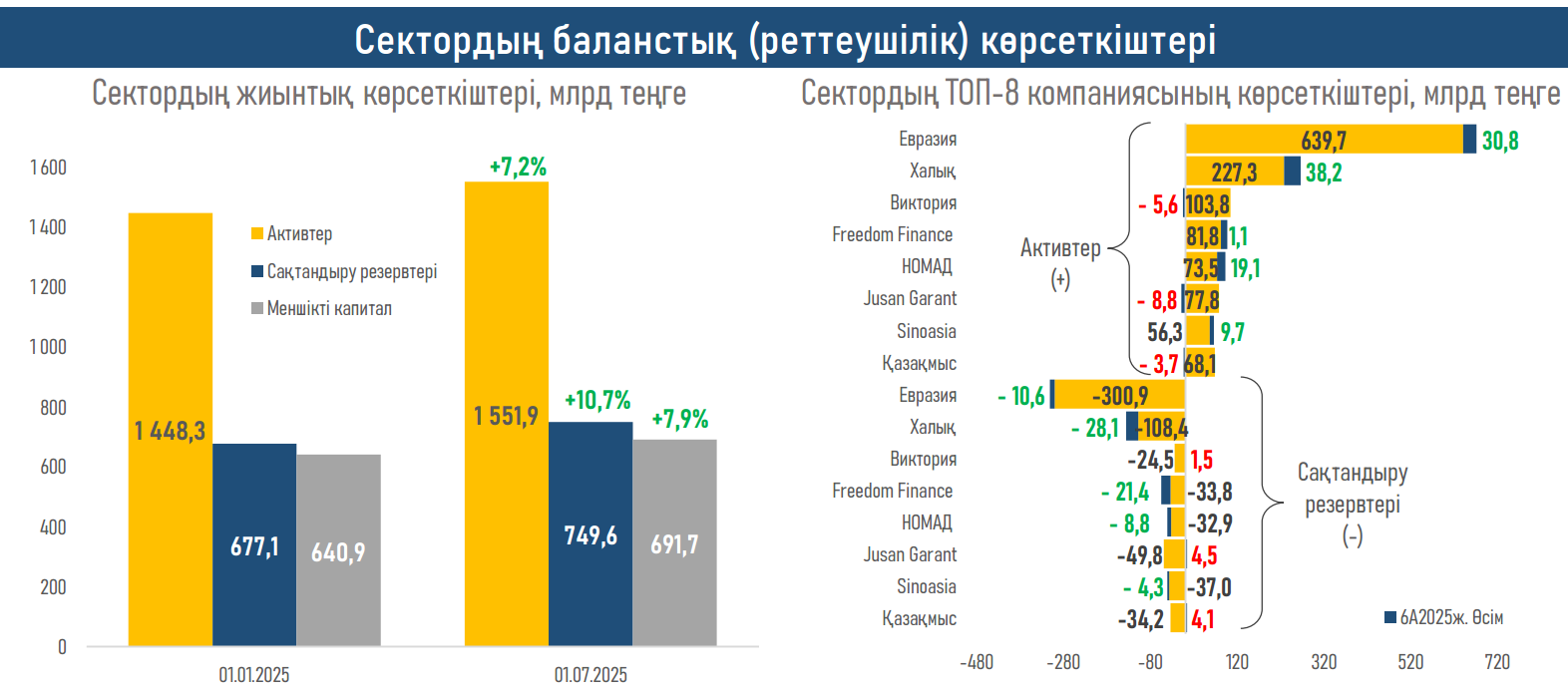 - 2025 жылғы қаңтар-маусымда жалпы сақтандыру компанияларының (ЖСК) активтері 2024 жылғы ұқсас кезеңдегі 10,3% өсіммен салыстырғанда 7,2% - ға өсті.. ЖСК активтерінің өсуі сыйлықақыларға қарағанда сақтандыру төлемдерінің жеделдетілген өсуі және инвестициялардан түсетін кірістердің қысқаруы есебінен баяулады.