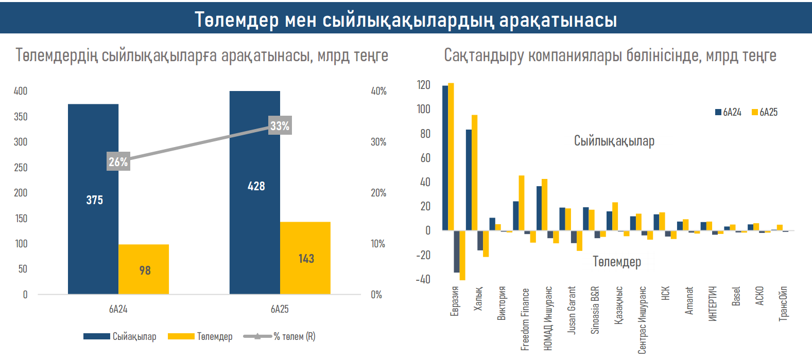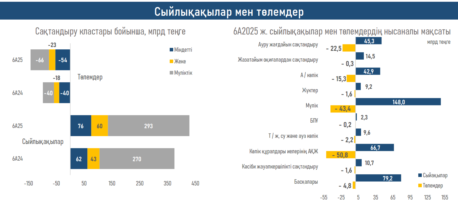 - 2025 ж. қаңтар-маусым айларында ЖСК сақтандыру төлемдерінің өсімі 45% (6А24ж. үшін+10,8%) құрады және ауырған жағдайда сақтандыру (+24,1% немесе ₸4,4 млрд), автокөлік иелерінің АҚЖ (+29,4% немесе ₸11,6 млрд) және мүлікті залалдан сақтандыру (+92,4% млрд немесе ₸20,9 млрд) бойынша төлемдермен қамтамасыз етілді