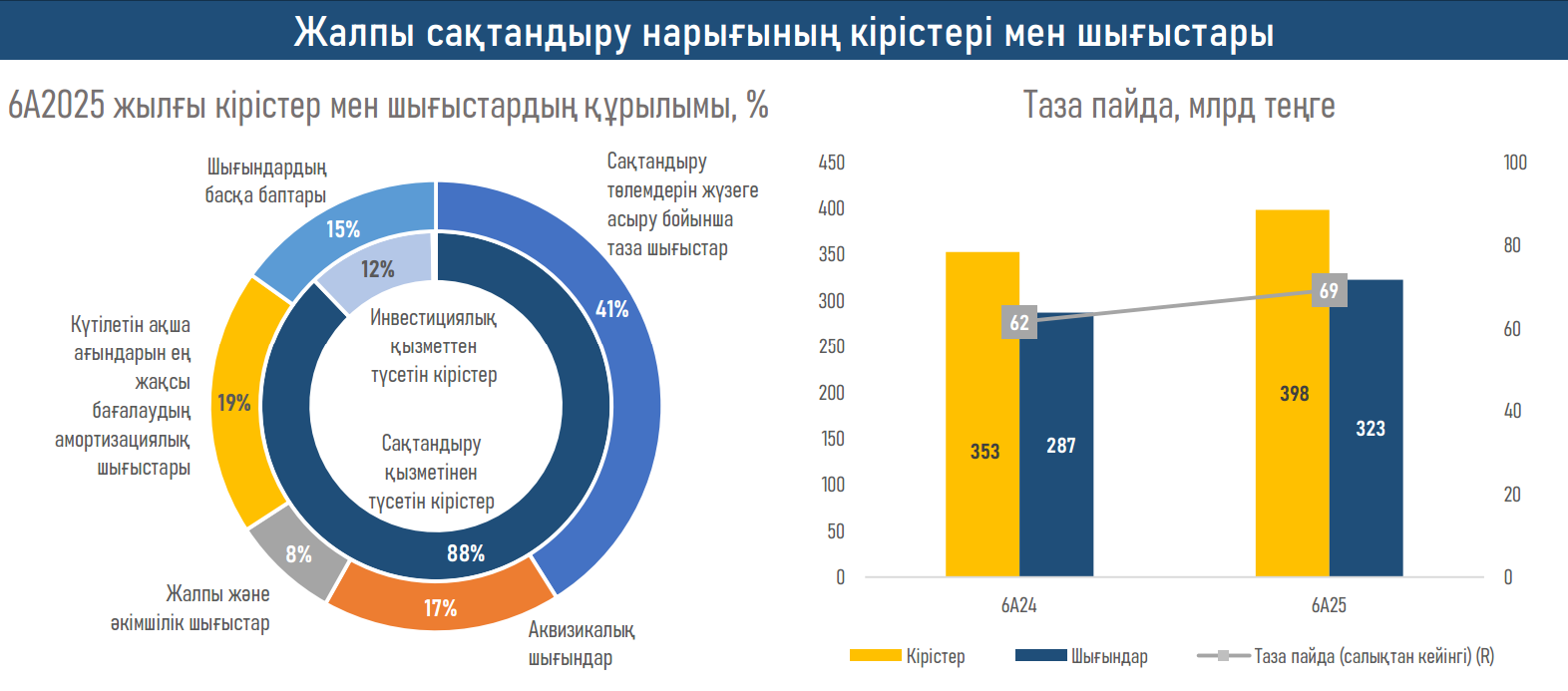 - Сақтандыру қызметінен түсетін кірістің өсуінің арқасында 2024 жылдың ұқсас кезеңінде ЖСК пайдасы 12%-ға, 2024 жылдың сәйкес кезеңіндегі ₸61,2 млрд көрсеткіштен ₸69,3 млрд-қа дейін өсті (+₸62,2 млрд) және шетел валютасын қайта бағалауға байланысты инвестициялық қызметтен түсетін кірістердің (-₸16,6 млрд) төмендеуіне қарамастан (USDKZT бағамы 525,1-ден 519,73-ке дейін төмендеді) және шығыстардың жалпы өсіміне (+₸35,5 млрд), негізінен сақтандыру төлемдерінің ұлғаюына байланысты.
