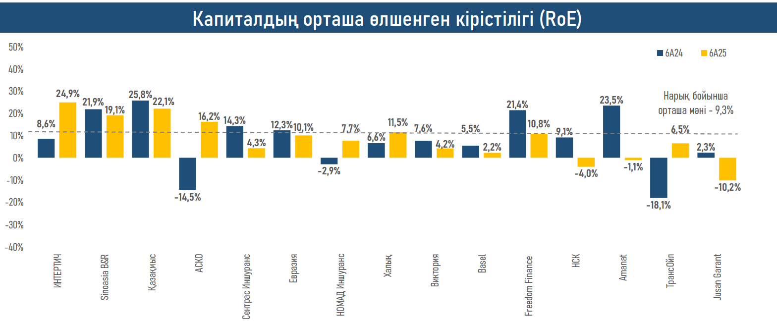 Екінші жағынан, сақтандыру төлемдерінің күрт өсуі (+45% ж/ж), әсіресе автокөлік иелерінің АҚЖ, мүліктік сақтандыру және ауырған жағдайда сақтандыру бойынша шығындардың өсуіне әкелді. Төлемдердің сыйлықақыларға қатынасы 33%-ға дейін өсті (бір жыл бұрынғы 26%-ға қарсы), ал меншікті капиталдың орташа кірістілігі 2024 жылғы 10,4%-дан 9,3%-ға дейін төмендеді, бұл тарифтерді түзетуді және андеррайтерлік тәсілді қатаңдатуды талап етуі мүмкін.