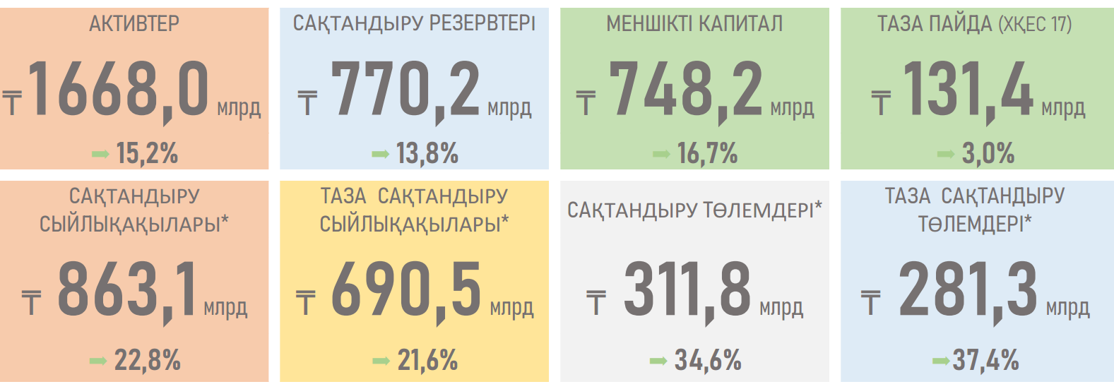 - Сақтандыру төлемдерінің өсуі салыстырмалы түрде сыйлықақыларының өсімінен айтарлықтай асып түсті (12 п.т.-қа): олардың көлемі өткен жылғы 9,2% өсіммен салыстырғанда 34,6%-ға ұлғайды. Мұндай серпін мүлікті зақымданудан сақтандыру бойынша төлемдердің артуымен (+29 млрд теңге), автокөлік иелерінің азаматтық-құқықтық жауапкершілігін сақтандыру (+26 млрд теңге) және ауру жағдайынан сақтандыру (+9 млрд теңге) сегменттеріндегі төлемдердің өсуімен қамтамасыз етілді.