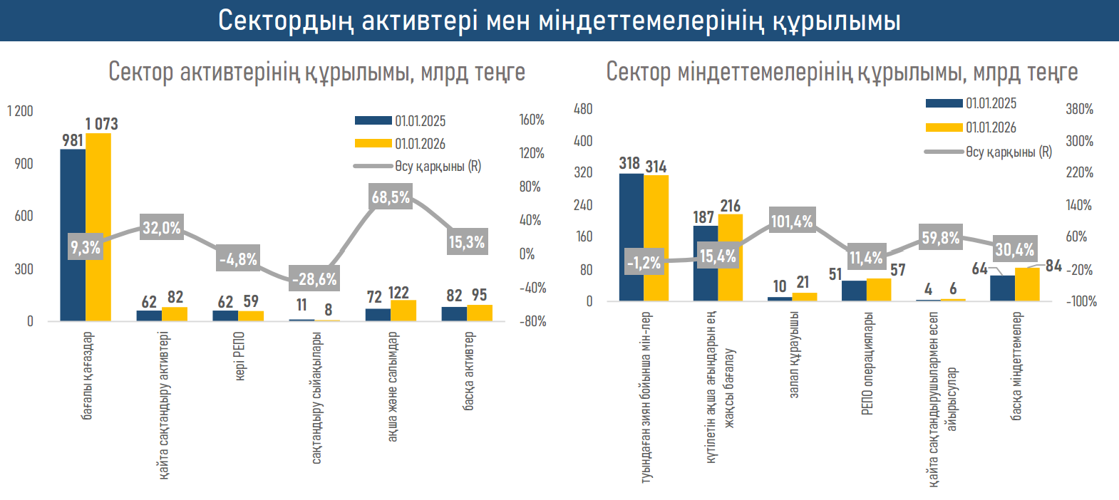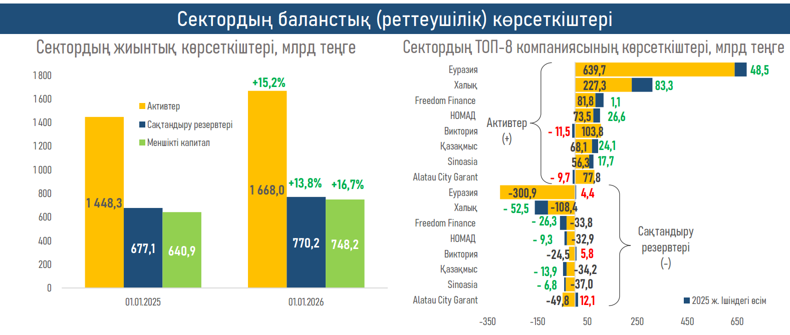 - Активтер құрылымы нарықтың өзгермелі макроортаға бейімделуін көрсетеді. Негізгі өсім жергілікті және шетелдік қор нарықтарының қолайлы серпіні аясында бағалы қағаздарға (+92 млрд теңге), сондай-ақ жоғары пайыздық мөлшерлемелер жағдайында банктік салымдарға (+49 млрд теңге) тиесілі болды. Бұл портфельдің өтімділігі мен табыстылығын сақтау үшін пайыздық циклдің неғұрлым белсенді қолданылғанын көрсетеді.