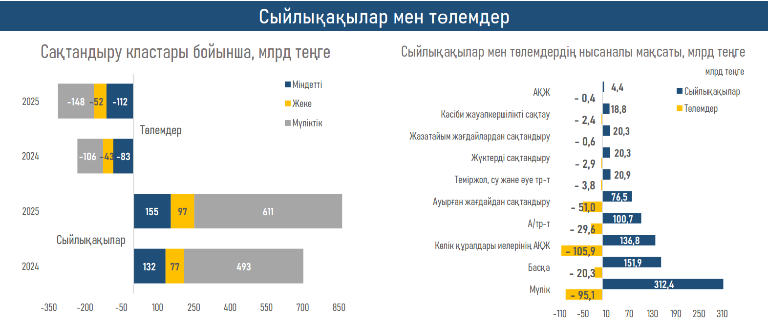 2025 жылы сақтандыру өнімдеріне сұраныс барлық сегменттерде екі таңбалы өсімді көрсетті: міндетті сақтандыру бойынша сыйлықақылар +16,9% немесе 22,4 млрд теңге, ерікті жеке сақтандыру бойынша +25,3% немесе 19,5 млрд теңге және ерікті мүлікті сақтандыру бойынша +24,0% немесе 118,3 млрд теңгеге ұлғайды.