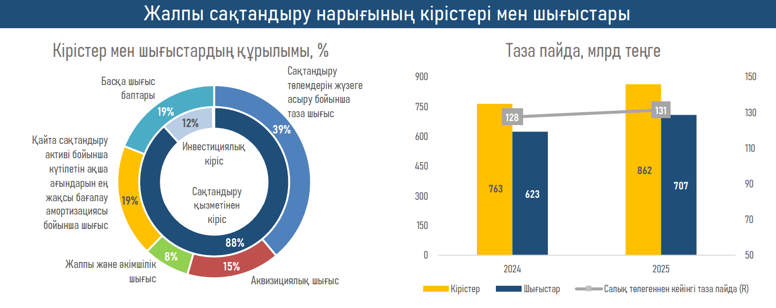 - ЖСК таза пайдасы 3%-дық қалыпты өсіммен ₸127,5 млрд-тан ₸131,4 млрд-қа жетті. Пайданың өсуін тежеген негізгі факторларға инвестициялық кірістің қысқаруы (-₸56 млрд), сақтандыру төлемдерінің жедел өсуі, болашақ міндеттемелерге арналған резервтердің ұлғаюы, сондай-ақ корпоративтік табыс салығының (КТС) екі есеге жуық өсуі (+₸10 млрд) жатады. Бұл факторлар сақтандыру портфелін кеңейту мен сыйлықақылар өсімінен түскен оң әсерді толықтай теңестірді.