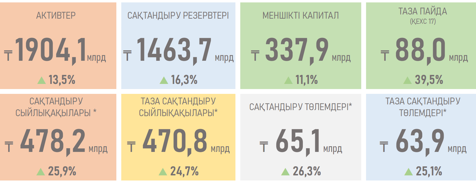 - ӨСК міндеттемелерінің көлемі көлемнің ұлғаюы аясында сақтандыру шартында көзделген қызметтер үшін маржа (+₸11,9 млрд немесе 7,0%) және күтілетін ақша ағындарының ең жақсы бағасының өсуі есебінен (+₸114,9 млрд немесе 15,6%), көп дәрежеде₸1,4 трлн (+₸132,3 млрд немесе +10,7%) дейін өсті жаңа шарттар мен ұзақ мерзімді сақтандыру өнімдеріне жоғары сұраныс. Бұл өсімнің едәуір бөлігін нарықтағы ең ірі үш ойыншы қамтамасыз етеді.