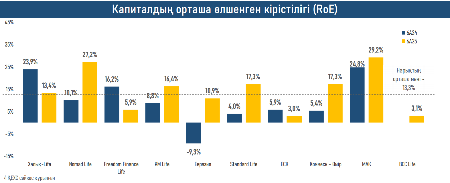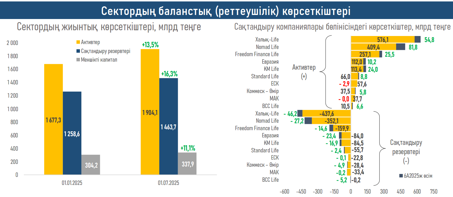 - Өмірді сақтандыру секторындағы шоғырлану жоғары болып қалуда: активтердің 73,8% үш компанияда шоғырланған — Nomad Life (1Ж25ж. да+₸81,8 млрд), Халық-Life (+₸54,8 млрд) және FFLife (+₸25,5 млрд).