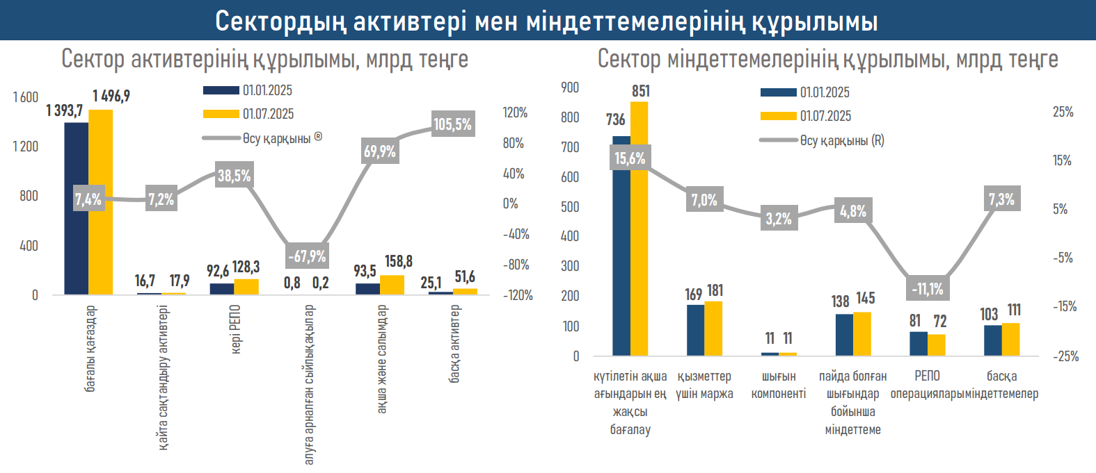 - Осы сектордың таза кірісі сақтандыру кірісінің (+30,2 млрд), бағалы қағаздар бойынша сыйақылардың (+26,5 млрд) және сақтандыру бойынша қаржылық кірістердің (+19,4 млрд) айтарлықтай өсуіне байланысты айтарлықтай жоғары қалыптасты (₸88,0 млрд vs ₸63,1 млрд 6А24), бұл операциялық және инвестициялық кіріс базасының өсуінің көрінісі болды.