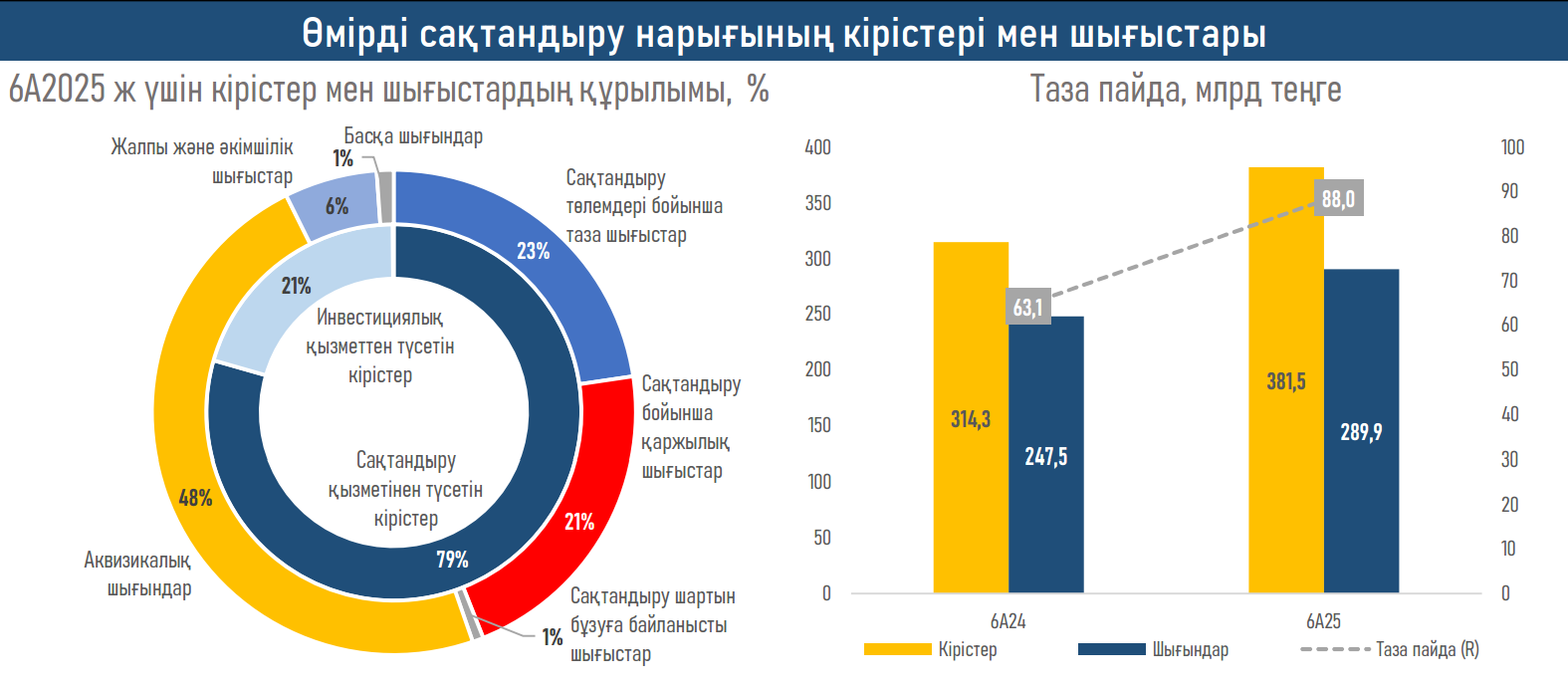 - Бұл өсімнің драйвері ерікті жеке сақтандыру өнімдері болды: бірлескен аннуитетті енгізу, жеке тұлғалардың жекелеген санаттары үшін зейнетақы аннуитетінің қолжетімділігін арттыру, БЖЗҚ бойынша аударымдар сомасын (+30%) және БЖЗҚ салымшыларымен жасалған шарттар санын (+109,3%) ұлғайту есебінен зейнетақы аннуитеттері бойынша жинақталған сыйлықақылар (+₸48,0 млрд)айтарлықтай өсті, сондай-ақ қамтудың кеңеюіне, кредиттік сақтандыруға және өнімді белсенді жылжытуға байланысты өмірді сақтандыру (+₸24,3 млрд).
