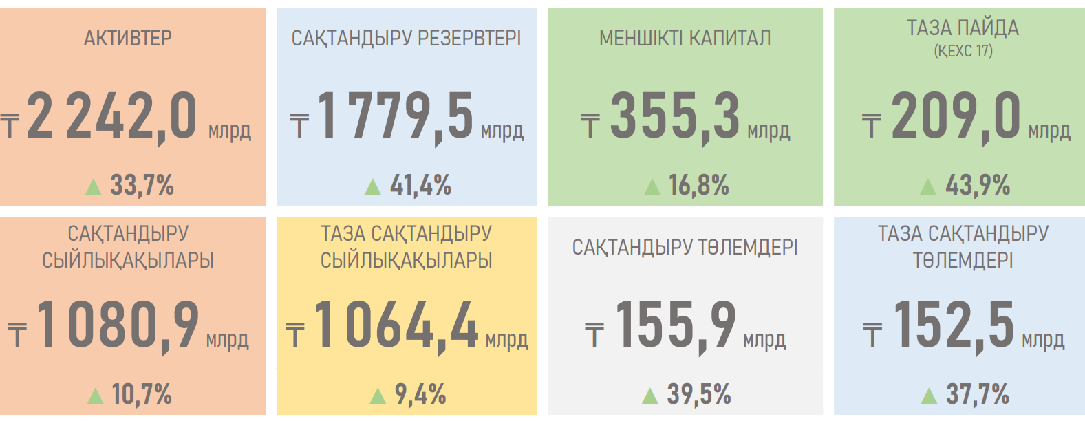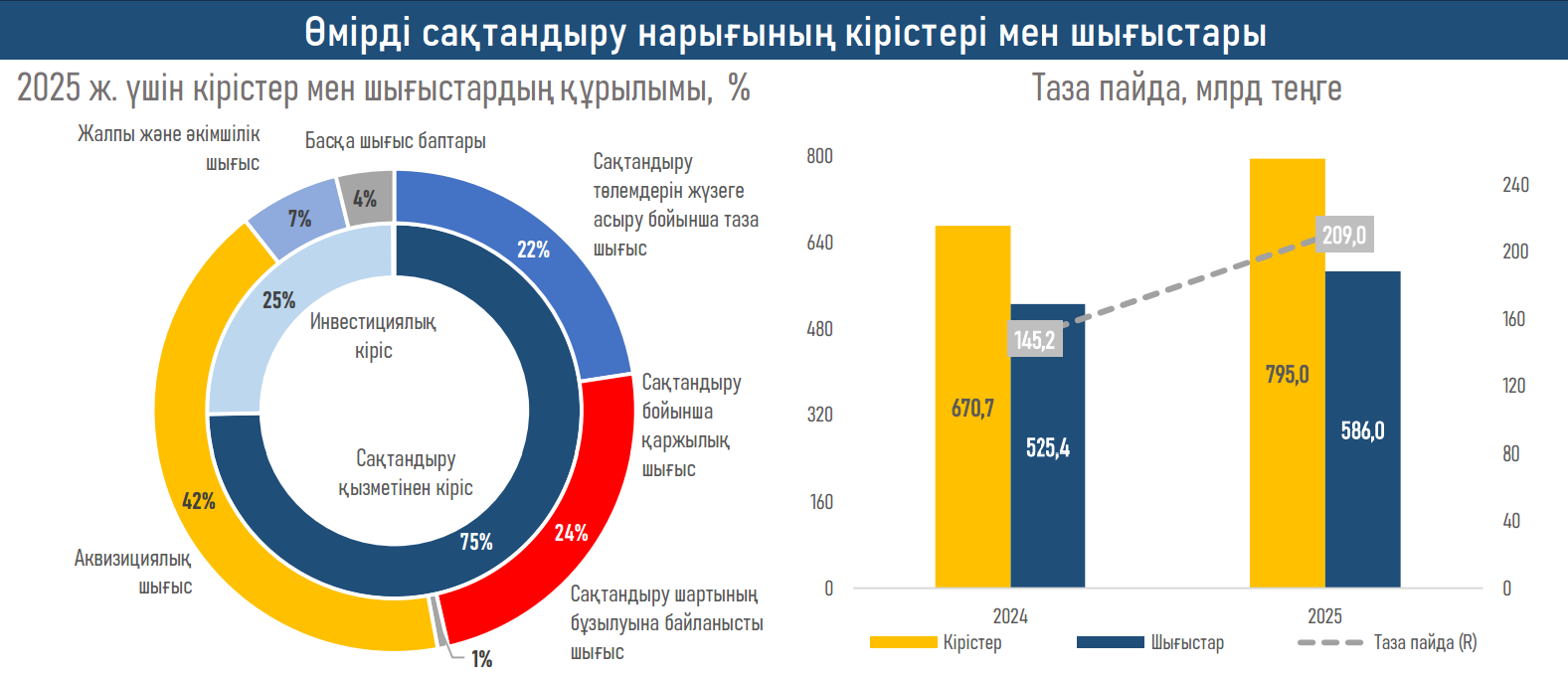 - Төлемдердің озу қарқынымен өсуіне қарамастан, таза пайда 44%-ға ұлғайып, ₸209 млрд-қа жетті. Бұған сақтандыру түсімінің өсуі (+₸25 млрд), инвестициялық кірістің (+₸23 млрд) және қаржылық активтермен операциялардың (+₸9 млрд) оң динамикасы, сондай-ақ операциялық шығыстарды (аквизициялық, жалпы және әкімшілік шығыстарды) оңтайландыру ықпал етті.