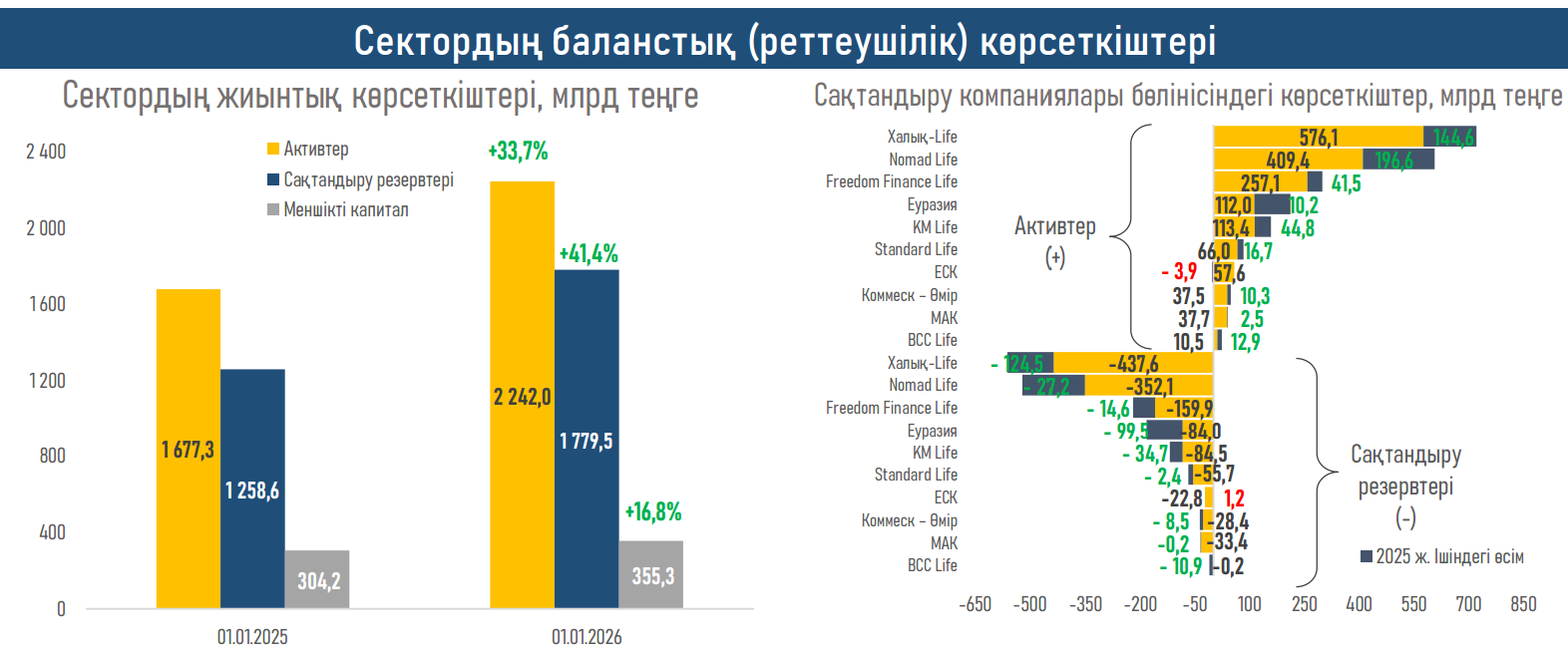 - Өмірді сақтандыру компанияларының (ӨСК) активтері ₸2,2 трлн-ға дейін өсіп, 565 млрд теңге немесе +33,7%) артты және сақтандыру нарығының 57,3%-ын (2024 жылы – 53,7%) құрады. Бұл өнім желісінің кеңеюі және жинақтаушы мен инвестициялық өнімдерге сұраныстың артуымен байланысты.