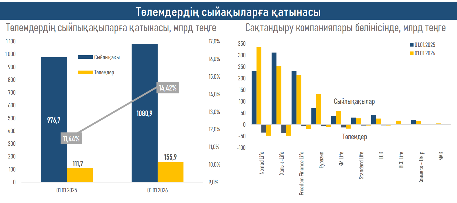 - Алайда, аннуитеттік сақтандыру бойынша сыйақылардың өсуі (+15% немесе ₸67 млрд), бірлескен аннуитетті енгізу және оны жеке категориядағы тұлғалар үшін қолжетімділікті арттырумен байланысты, сондай-ақ өмірді сақтандыру бойынша сыйақылардың өсуі (+24% немесе ₸57 млрд) клиенттерді қамтудың артуы және өнімді белсенді насихаттау нәтижесінде жалпы жинақтарды қолдап отырды.