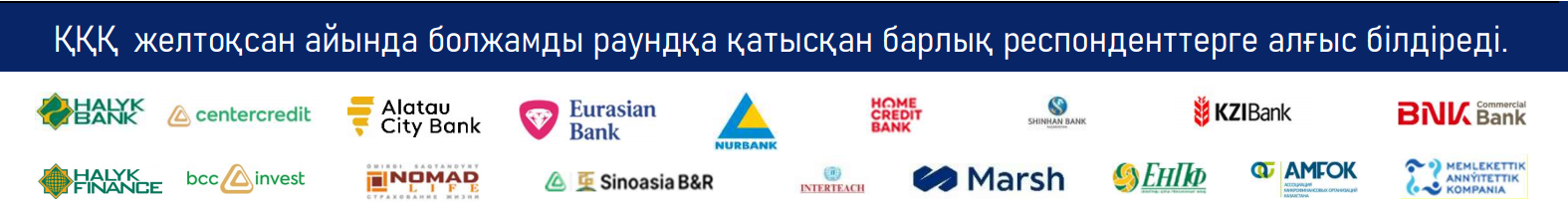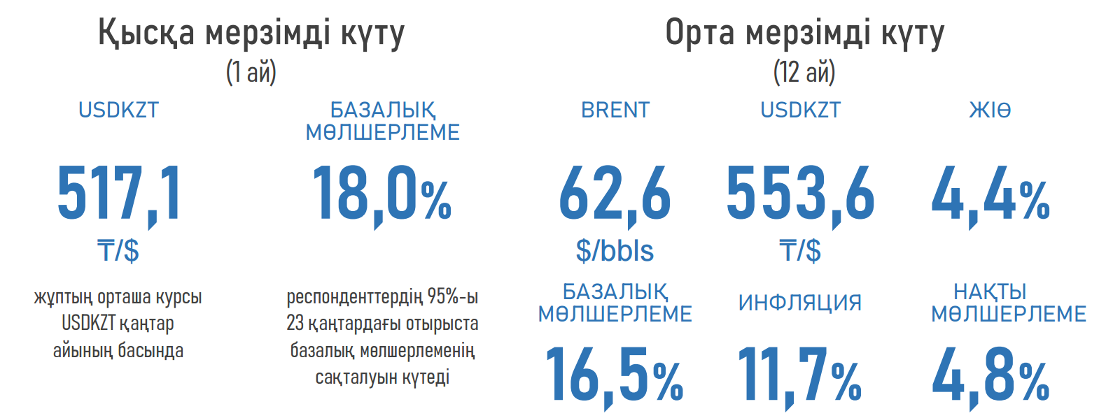 Зерттеуде қаржы нарығының кәсіби қатысушыларының, банк, сақтандыру, брокерлік ұйымдар өкілдерінің, талдау және қазынашылық бөлімшелері қызметкерлерінің пікірі зерделенді. Осы жарияланымда келесі негізгі индикаторлар бойынша болжамдарға қатысты сұрақтарға респонденттердің жауаптары берілген: