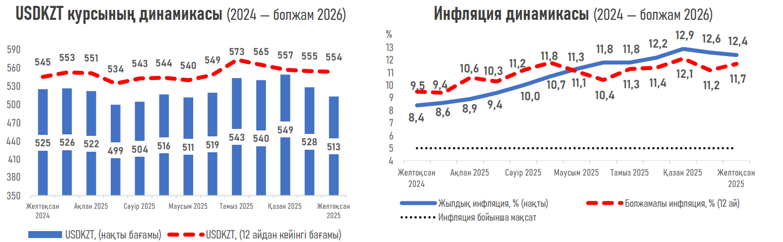 - Алайда 12 айлық көкжиекте доллардың ұлттық валютаға қатысты өсуі 9% деңгейінде болуы мүмкін (ағымдағысы — 508,1), яғни 553,6 ₸/$ деңгейіне дейін. Мұндай динамиканың негізгі факторлары ретінде шикізат экспорты кірістерінің төмендеуі, инвестициялық және инфрақұрылымдық жобаларды іске асыру аясында импорттың өсуі, сондай-ақ келесі жылы Ұлттық қордан берілетін трансферттердің екі есеге жуық қысқаруы (2025 жылы ₸5,3 трлн-нан ₸2,8 трлн-ға дейін) атап өтіледі.