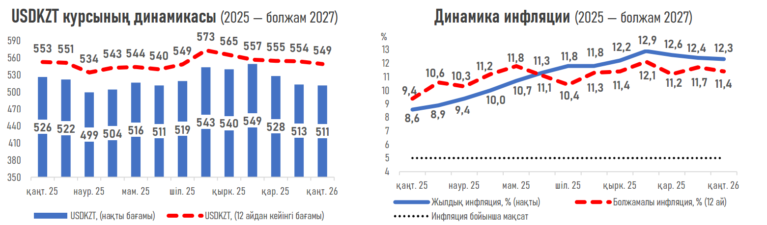 - USDKZT айырбастау бағамы бір айдан кейін бір доллар 516,5 теңгеге (бұрын 517,1), ал бір жылдан кейін бір доллар 549,1 теңгеге (бұрын 553,6) жетеді деп болжануда. Ақпан айында валюта нарығындағы тепе-теңдік тұрақтырақ жағдайға ауысуы мүмкін, өйткені нарық дәстүрлі түрде өткен жылғы үлкен салық міндеттемелерін төлеуге байланысты шетел валютасының қосымша ұсынысын көреді.