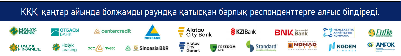 Зерттеуде қаржы нарығының кәсіби қатысушыларының, банк, сақтандыру, брокерлік ұйымдар өкілдерінің, талдау және қазынашылық бөлімшелері қызметкерлерінің пікірі зерделенді. Осы жарияланымда келесі негізгі индикаторлар бойынша болжамдарға қатысты сұрақтарға респонденттердің жауаптары берілген:
