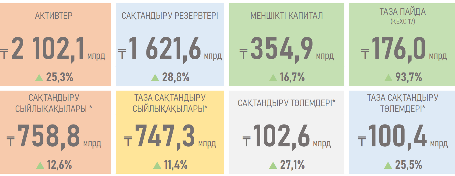 - Негізгі үлесті зейнетақы аннуитеттері (+₸33,4 млрд) бірлескен аннуитетті енгізу, оны белгілі топтарға қолжетімділікті арттыру, біржолғы зейнетақы төлемдері БЗТ аударымдарының көлемінің өсуі (+₸16,3 млрд немесе 6,4%) және өмірді сақтандыру (+₸48,1 млрд) арқылы қамту аймағының кеңеюі, несиелік сақтандыру және өнімді белсенді насихаттау есебінен қамтамасыз етті.