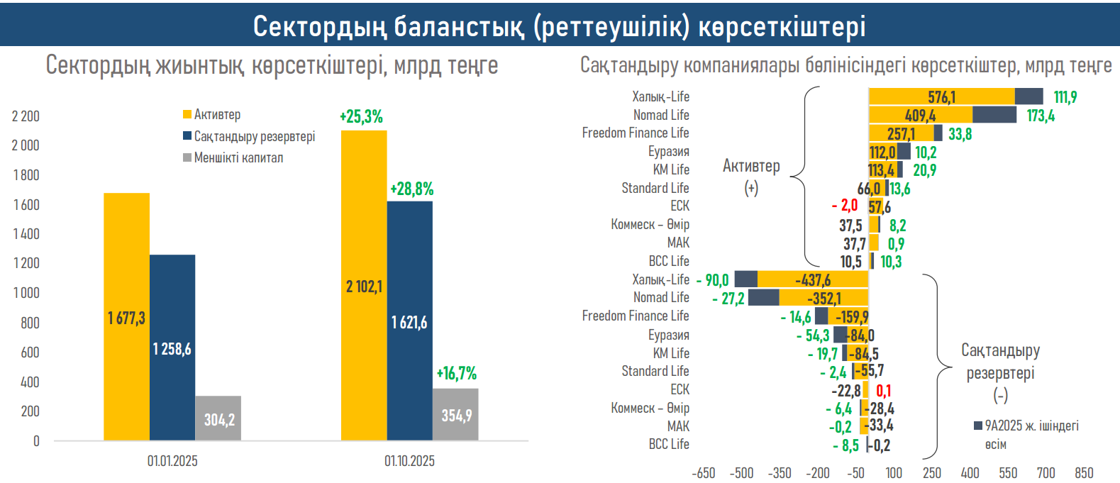 - Өмірді сақтандыру компанияларының міндеттемелері ₸1,5 трлн-ға дейін өсіп, (+₸263,2 млрд немесе 21,2%) артты. Драйверлер ретінде күтілетін ақшалай ағындарды жақсырақ бағалау (+₸188,4 млрд немесе 25,6%) және шарт бойынша көрсетілетін сақтандыру қызметтері маржасы (+₸33,3 млрд немесе 19,7%) септігін тигізді. Бұл келісімшарттар портфелінің кеңеюін (+6,1% дейін 563,8 мың) және жинақтаушы өнімдер бойынша міндеттемелердің өсуін көрсетеді. Жоғары концентрация сақталуда: ең ірі үш сақтандырушы — Halyk-Life (+₸111,9 млрд), Nomad Life (+₸173,4 млрд) және FFLife (+₸33,8 млрд) — сектор активтерінің 74,3%-ын құрайды. Бұл масштаб әсерінің, жоғары операциялық тиімділіктің және кең клиенттік базаға қолжетімділіктің маңызды екенін айқын көрсетеді.