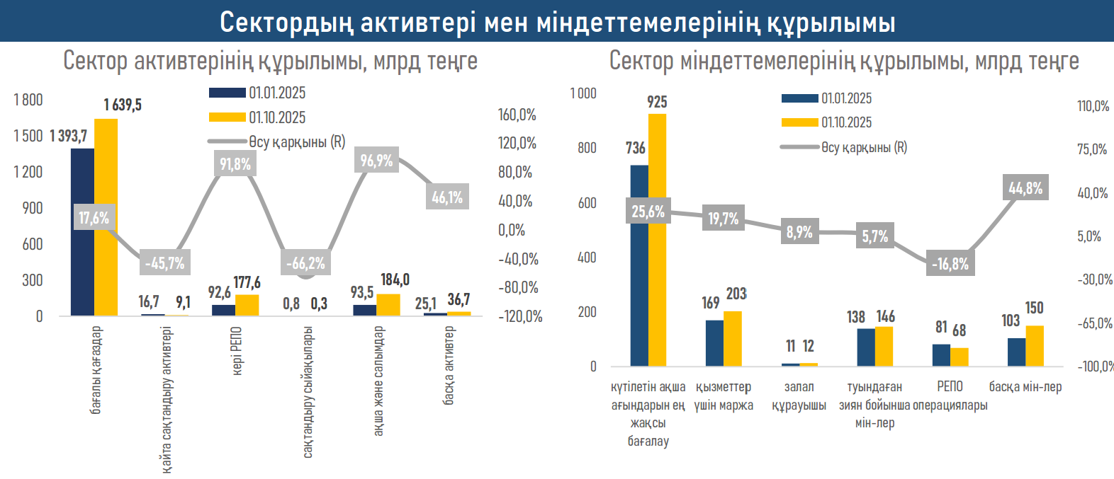 - Активтердің құрылымы өтімділік пен кірістілікті біріктіретін құралдарға бетбұрыс жасап отырғанын көрсетеді. 2025 жылғы 1 қазан жағдайына негізгі өсім бағалы қағаздарда (+₸245,8 млрд немесе 17,6%), қолма-қол ақша мен салымдарда (+₸90,5 млрд немесе 96,9%) және кері репо операцияларында (+₸85,0 млрд немесе 91,8%) тіркелді. Бұл – пайыздық мөлшерлемелердің жалпы өсуі мен сақтандыру компанияларының өтімділікті қолдау мақсатында қысқа мерзімді сегментке бағдарлануы аясында орын алды.