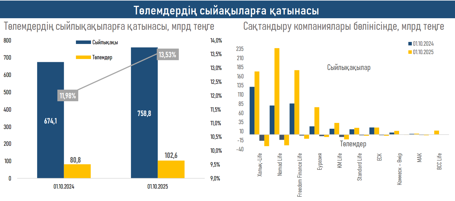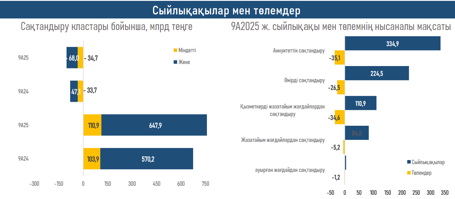 2025 жылдың қаңтар–қыркүйек айларында экономикалық белсенділіктің үдеуі, жұмыспен қамтудың және жалақының өсуі аясында өмірді сақтандыру компанияларының негізгі өнімдеріне сұраныс артты — жеке тұлғалар тарапынан зейнетақы аннуитеттері мен өмірді сақтандыру, ал заңды тұлғалар тарапынан қызметкерлерді апаттық жағдайдан сақтандыру. Осы үш бағыт өмірді сақтандыру компанияларының жалпы сыйақылар өсімін қалыптастырды, оның ішінде зейнетақы аннуитеттері мен өмірді сақтандыруға өсуінің 96%-ы тиесілі болды. Бұл халықтың ұзақ мерзімді қаржылық құралдарға қызығушылығының артуын және сақтандыруды жеке қаржылық жоспарлаудың маңызды элементі ретінде қабылдауын көрсетеді.