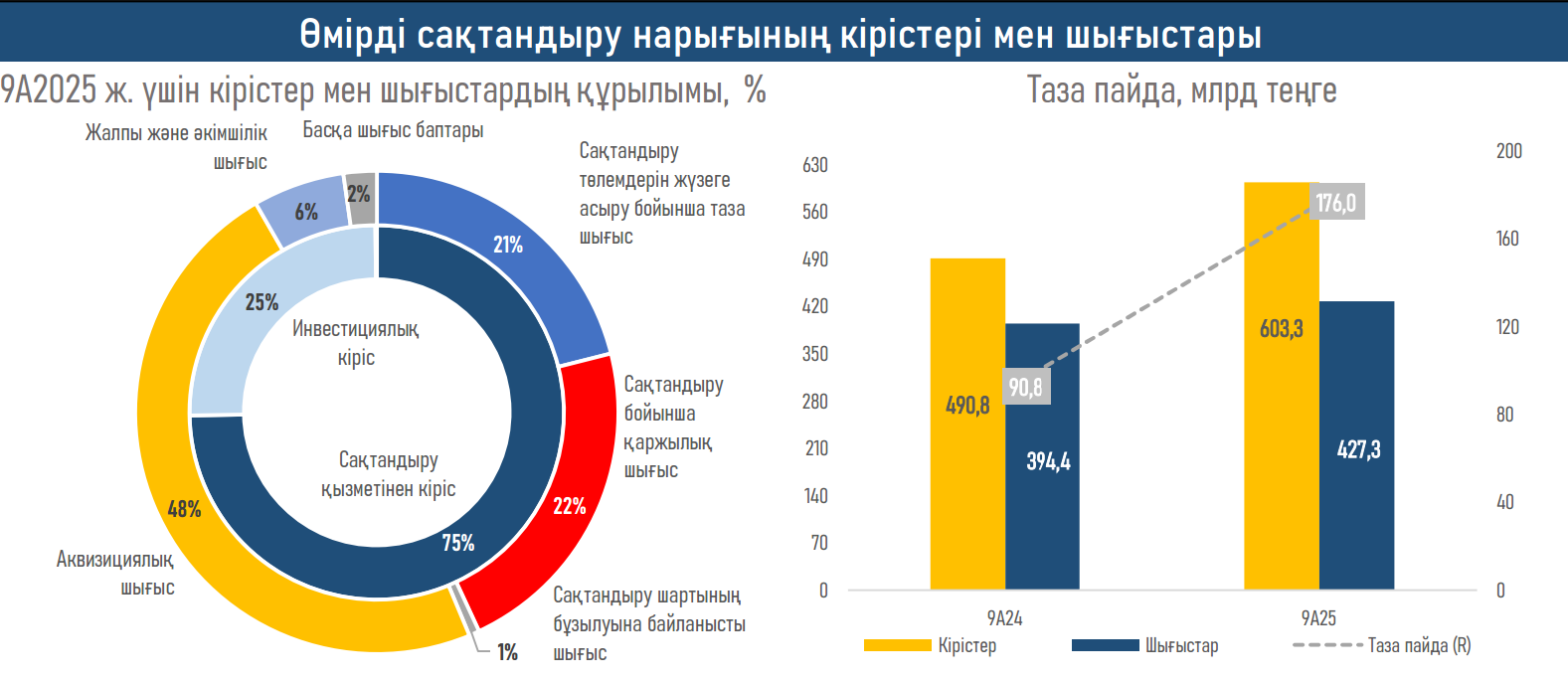 - 2025 жылдың 9 айының қорытындысы бойынша өмірді сақтандыру компанияларының барлық негізгі көрсеткіштері екі таңбалы өсім көрсетіп, бұл клиенттік базаның кеңеюі мен сақтандыру шешімдерінің тереңірек енгенін көрсетеді.