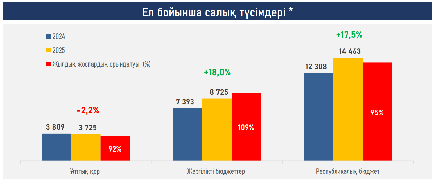 - 2025 жылы жиналған салық көлемі ₸26,9 трлн құрады, бұл 2024 жылғы ₸23,5 трлн көрсеткішімен салыстырғанда 14,5%-ға немесе ₸3,4 трлн-ға артық.