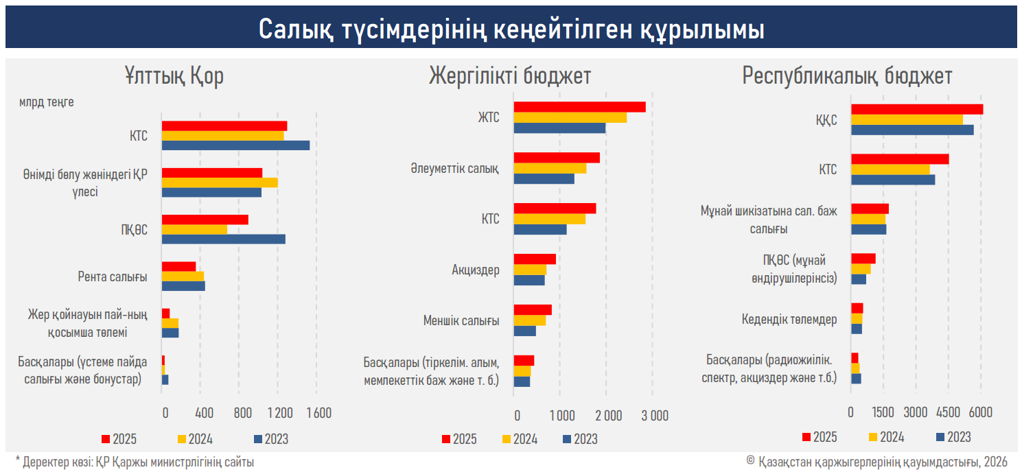 2026 жылы кіріс базасы мұнайдан тыс көздер есебінен одан әрі кеңейеді деп күтілуде. Бюджет түсімдеріне ҚҚС-тың алдағы уақыттағы өсімі (мөлшерлеменің көтерілуі, жоғары тұтыну деңгейі, екі таңбалы инфляция және әкімшілендіруді күшейту), кәсіпорындар пайдасы мен халықтың жұмыспен қамтылуының артуы аясында КТС және ЖТС бойынша жиналымдардың ұлғаюы, сондай-ақ ШОБ-тың салықтық базасының кеңеюі қолдау көрсетуі мүмкін.