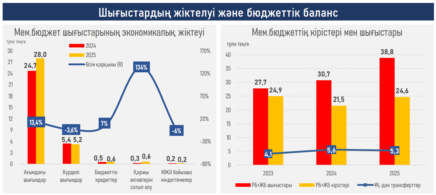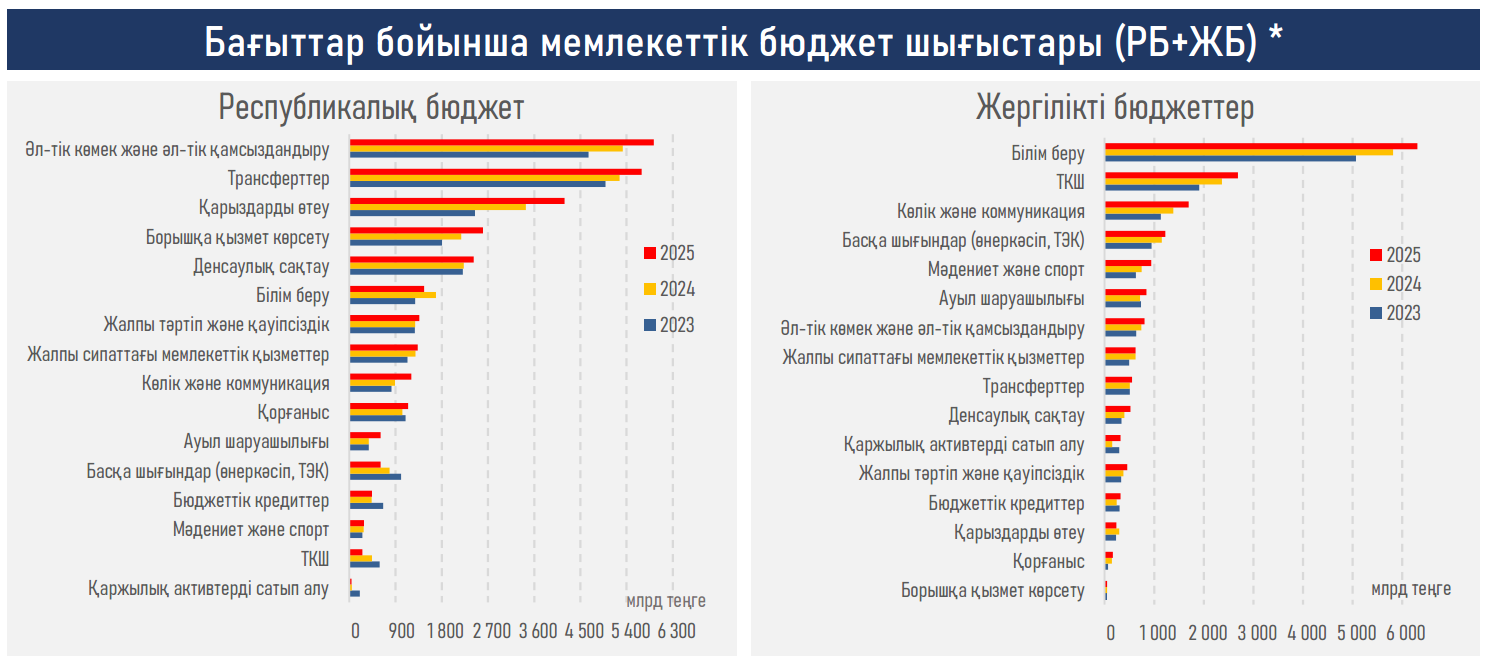 - Республикалық бюджет (РБ) шығыстары 7,9%-ға немесе ₸2,6 трлн-ға өсті (салыстыру үшін: 2024 жылы өсім +8,7% немесе ₸2,2 трлн болған). Бұл ретте негізгі өсімнің (85%) басым бөлігі қарыздарды өтеуге (+₸751 млрд), әлеуметтік көмек пен қамсыздандыруға (+₸604 млрд) және трансферттерге (+₸432 млрд) тиесілі болды.