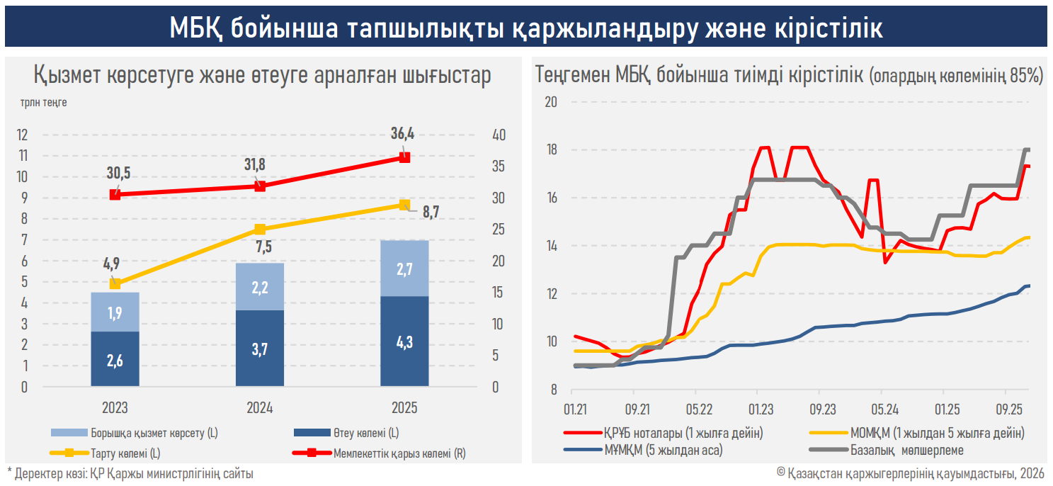 - Борышқа қызмет көрсету бойынша төлемдердің өсуі мемлекеттік қаржыға түсетін салмақты арттырып, икемді фискалдық саясат жүргізу мүмкіндігін шектейді. Ал жергілікті бюджет шығыстарының ұлғаюы, керісінше, мемлекеттік қызметтерді, коммуналдық және көлік инфрақұрылымын қаржыландырудың кеңеюін, сондай-ақ өңірлердің инвестициялық белсенділігін айғақтайды.