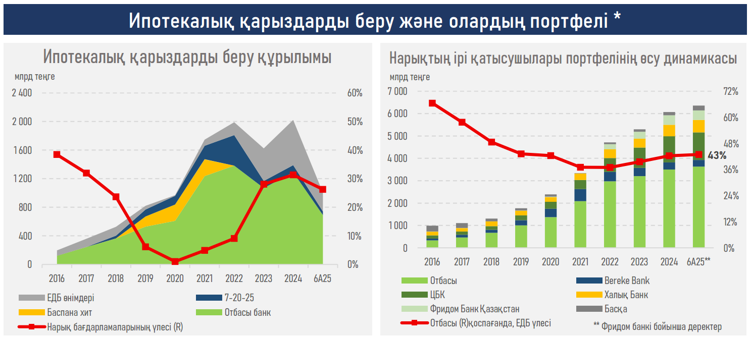 2025 жылдың бірінші жартыжылдығында ипотекалық нарық жыл басында әлсіз басталғаннан кейін қалпына келді және өсу траекториясына шықты: жаңа шығарылымдар 1,0 трлн (+24,9% ж/ж) жетті. Бұл ретте кеңейту бір сегментте — жеңілдікті бағдарламаларда шоғырланған, онда өсудің негізгі көзі Отбасы Банкі болды. Нәтижесінде ұстап қалулардың шоғырлануы күшейіп, екінші деңгейдегі банктердің нарықтық ипотекасы өз үлесін жоғалта берді.