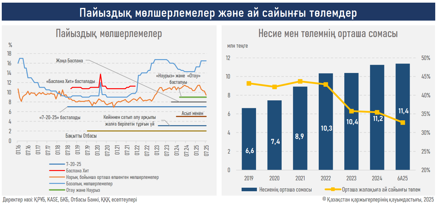 - Мөлшерлемелерді төмендету және жалақының жедел өсуі есебінен (+11,3%) ай сайынғы ипотекалық төлемнің жалақыға арақатынасы кредиттің орташа сомасының ₸11,4 млн-ға (₸11,2 млн-нан) дейін ұлғаюына қарамастан, 35,4%-дан 32,7%-ға дейін төмендеді.