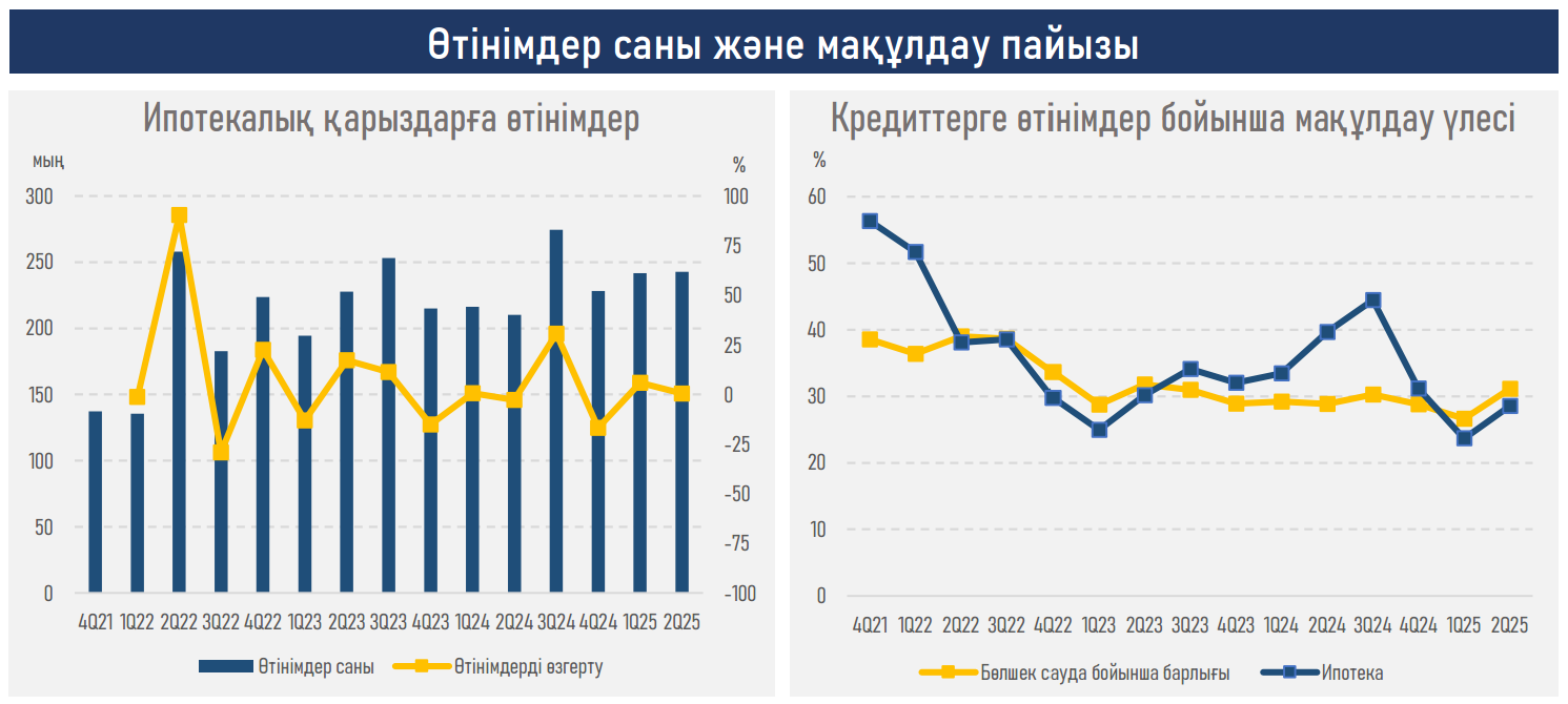 Орташа өлшенген мөлшерлемелердің төмендеуі және халықтың жалақысының өсуі борыштық жүктеме көрсеткіштерінің жақсаруын қамтамасыз етті: үй шаруашылықтарының төлем қабілеттілігі тұрғын үйдің қымбаттауына және сұраныстың біртіндеп ірі қарыздарға ауысуына қарамастан тұрақты болып көрінеді. Алайда, мұның артында онша қолайлы емес динамика тұр – мақұлданған өтінімдер үлесінің төмендеуі (төрттен біріне дейін), бұл сұраныс пен қарыз алушылардың банк критерийлеріне сәйкес келуінің нақты мүмкіндіктері арасындағы теңгерімсіздіктің өсуін білдіреді.