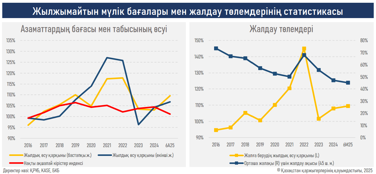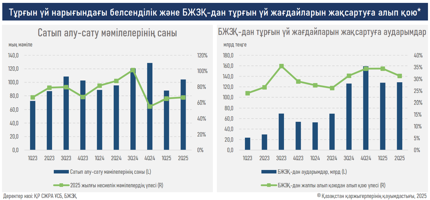 - Сатып алу-сату мәмілелерінің саны 191,8 мыңға дейін өсті (+4,3% 1ж24). БЖЗҚ — дан тұрғын үй жағдайларын жақсартуға арналған аударымдар маңызды рөл атқарды - ₸782,9 млрд (+71% ж/ж). Бұл нарықтық емес көздер жылжымайтын мүлік бағасын жоғарылату арқылы нарықтағы белсенділікті жалғастыруда.
