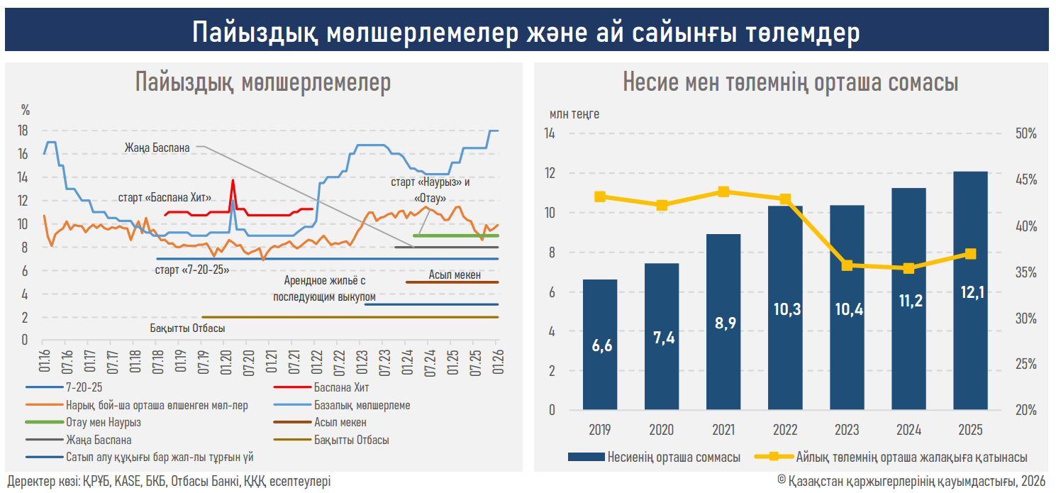 - Нәтижесінде жаңадан берілген қарыздардағы жеңілдетілген бағдарламалардың («Отбасы банк» және «7-20-25» бағдарламалары) үлесі 74%-ға дейін (бұған дейін 69%) артты, ал екінші деңгейлі банктердің (ЕДБ) нарықтық ипотекалық өнімдерінің үлесі 26%-ға (бұған дейін 31%) дейін төмендеді. Бұл коммерциялық сегменттің бейнарықтық қаржыландыру тетіктері арқылы нарықтан біртіндеп ығыстырылып жатқанын көрсетеді.