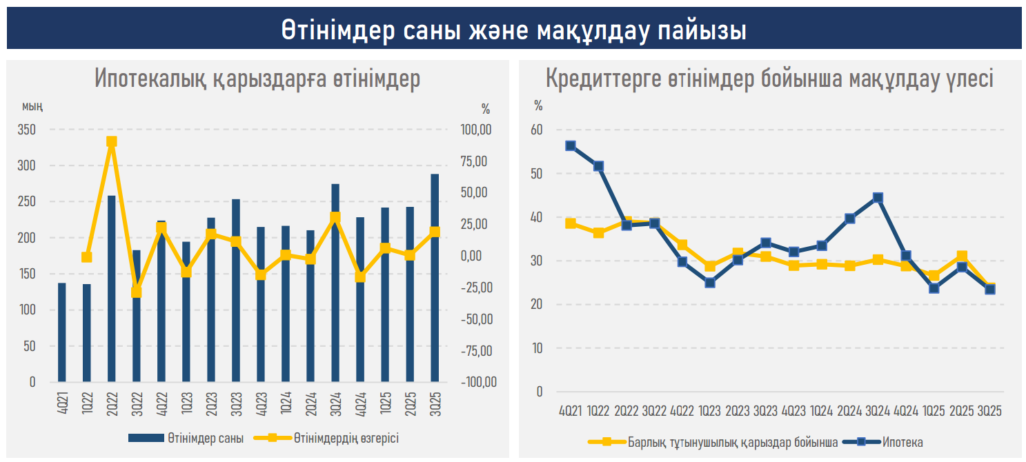 - Бұл үрдіс сұраныс құрылымынан көрініс тауып, ипотека нарығының көрсеткіштерімен де расталады: несиенің орташа сомасының артуы (бұрынғы ₸11,2 млн-нан ₸12,1 млн-ға дейін), мақұлданған өтінімдер үлесінің төмендеуі (бұрынғы 39,2%-дан 25,2%-ға дейін) және меншікті қаражат есебінен жасалған мәмілелер үлесінің ұлғаюы (бұрынғы 19%-дан 41%-ға дейін) сұраныстың табысы жоғары әрі қомақты бастапқы жарнасы бар, төлем қабілеті неғұрлым жоғары үй шаруашылықтары жағына қарай ойысқанын білдіреді.
