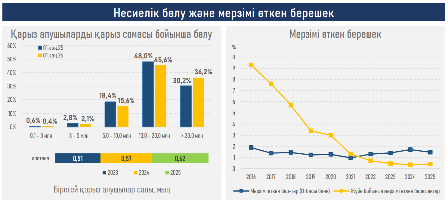- Жеңілдетілген бағдарламалардың басымдығына байланысты, жаңадан берілген қарыздар бойынша орташа өлшемді мөлшерлеме бір жыл бұрынғы 10,9%-дан 9,8%-ға дейін төмендеді. Бұл көрсеткіш базалық мөлшерлемеден (18%) және 2025 жылдың қорытындысы бойынша инфляция деңгейінен (12,3%) айтарлықтай төмен.