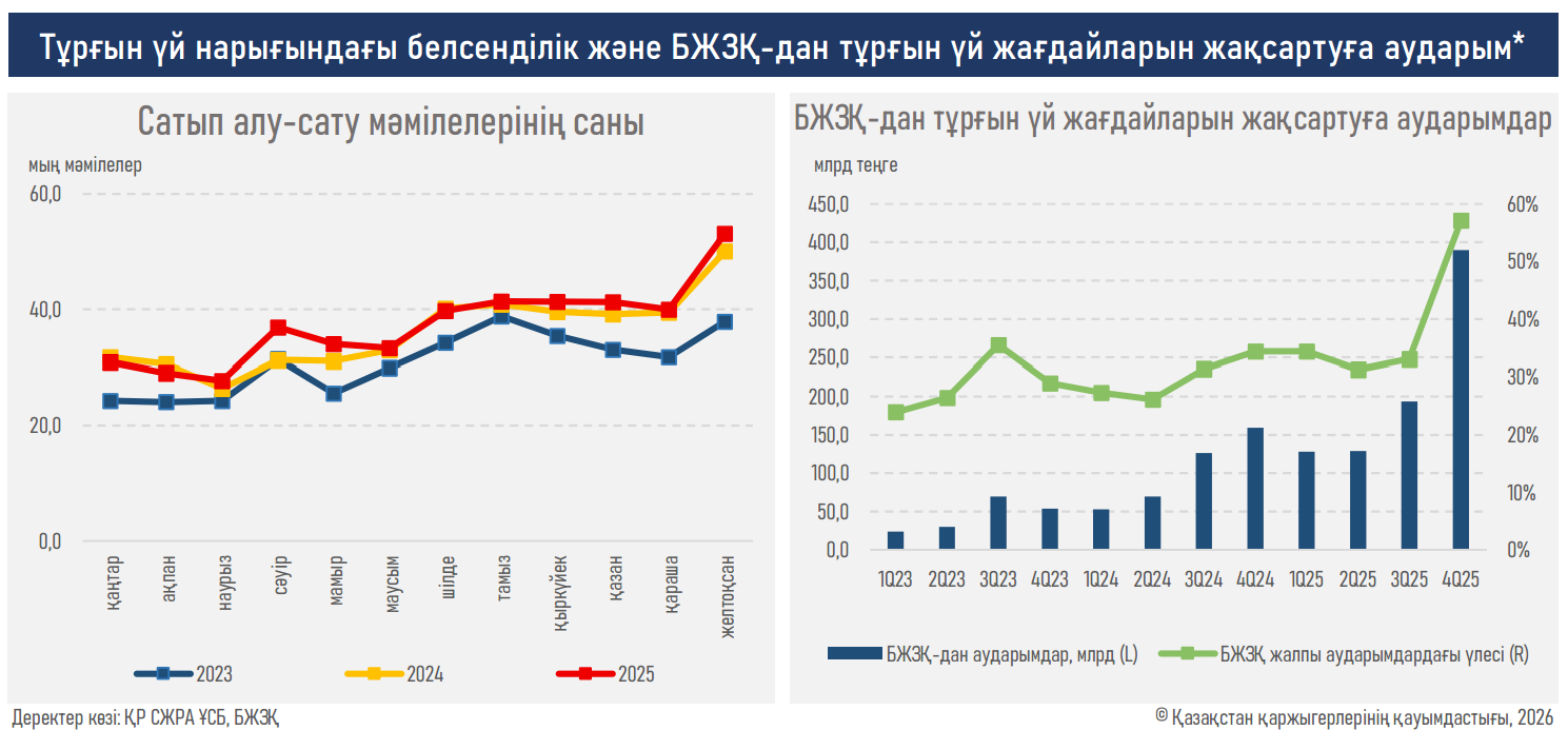 - 2026 жылдың І тоқсанында мемлекеттік сыйақылардың ертерек есептелуіне байланысты (ақпан айының соңында) тұрғын үй жағдайын жақсартуға деген сұраныстың одан әрі артуы күтілуде. Сыйақылар көлемі бір жыл бұрынғы ₸93,0 млрд көрсеткішінен ₸124,4 млрд-қа (+34%) дейін өсті.