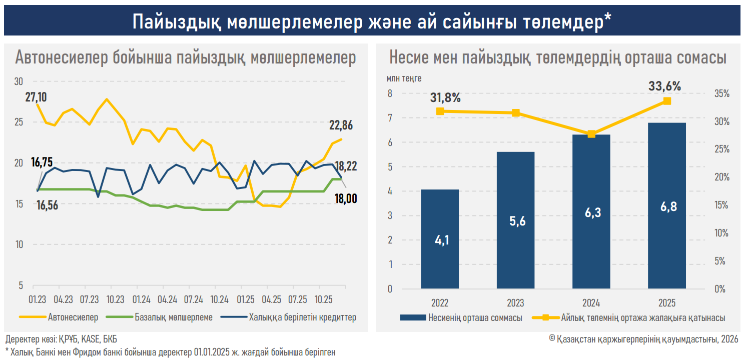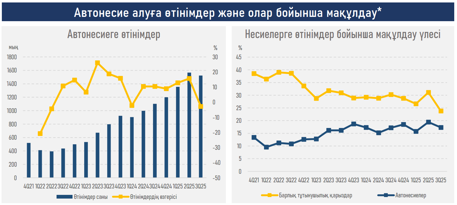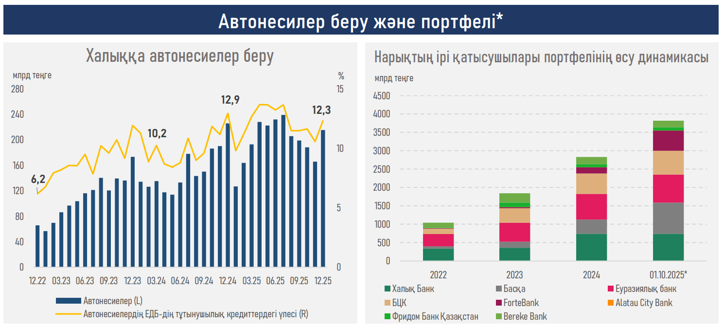 - 2025 жылдың қорытындысы бойынша жаңа автонесиелер беру көлемі 29,8%-ға ұлғайып, ₸2,4 трлн құрады (2024 жылы — ₸1,8 трлн). Бұл сегмент несие беру деңгейі бойынша алғаш рет ипотекалық несиелеу көрсеткіштерімен теңесті.