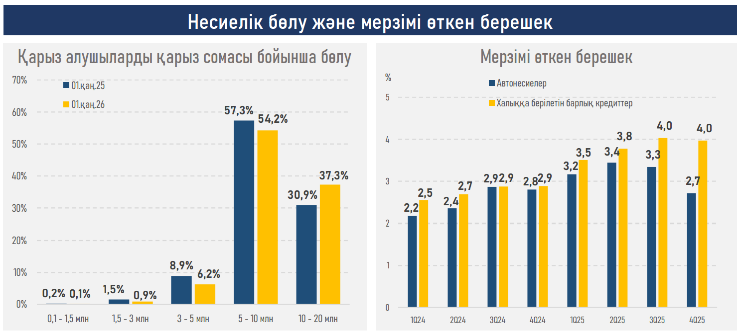 - Автонесиелер бойынша мерзімі өткен берешек үлесі жыл қорытындысы бойынша төмендеп (2,8%-дан 2,7%-ға дейін), бөлшек сауда сегментіндегі орташа деңгейден (4,0%) төмен сақталды. Бұл өнімнің қамтамасыз етілген сипатымен және қарыз алушыларды іріктеудің неғұрлым қатаң талаптарымен түсіндіріледі.
