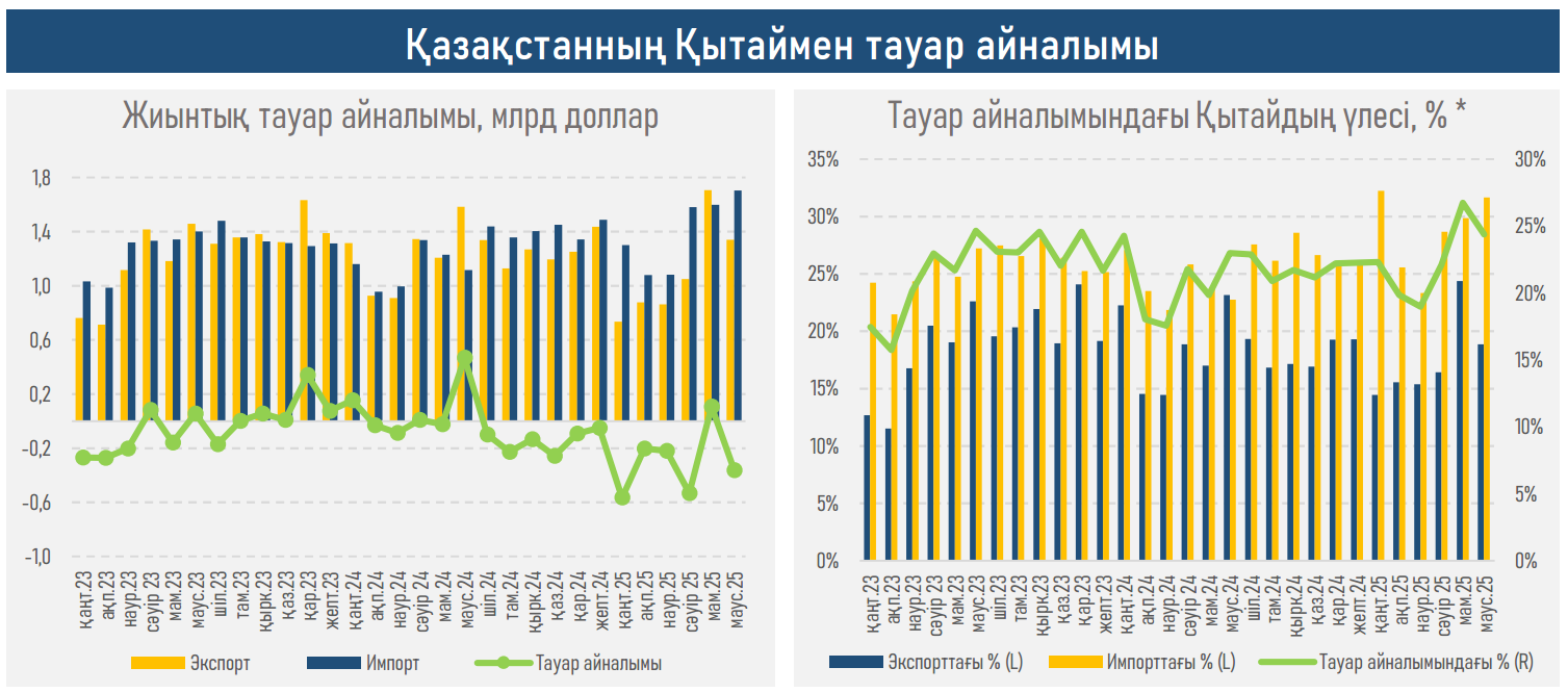 2025 жылдың бірінші жартыжылдығының қорытындысы бойынша Қытаймен өзара саудадағы тапшылық 2024 жыл ішінде $0,4 млрд-қа қарағанда $1,8 млрд-қа жетті, бұл сыртқы экономикалық байланыстардағы құрылымдық өзгерісті көрсетеді. Қытай Қазақстанның ең ірі сауда серіктесі ретінде ғана емес, сонымен қатар ішкі сұраныс үшін — техника мен металдардан тоқыма және мал шаруашылығы өнімдеріне дейін негізгі жеткізуші ретінде де позицияны бекітеді.