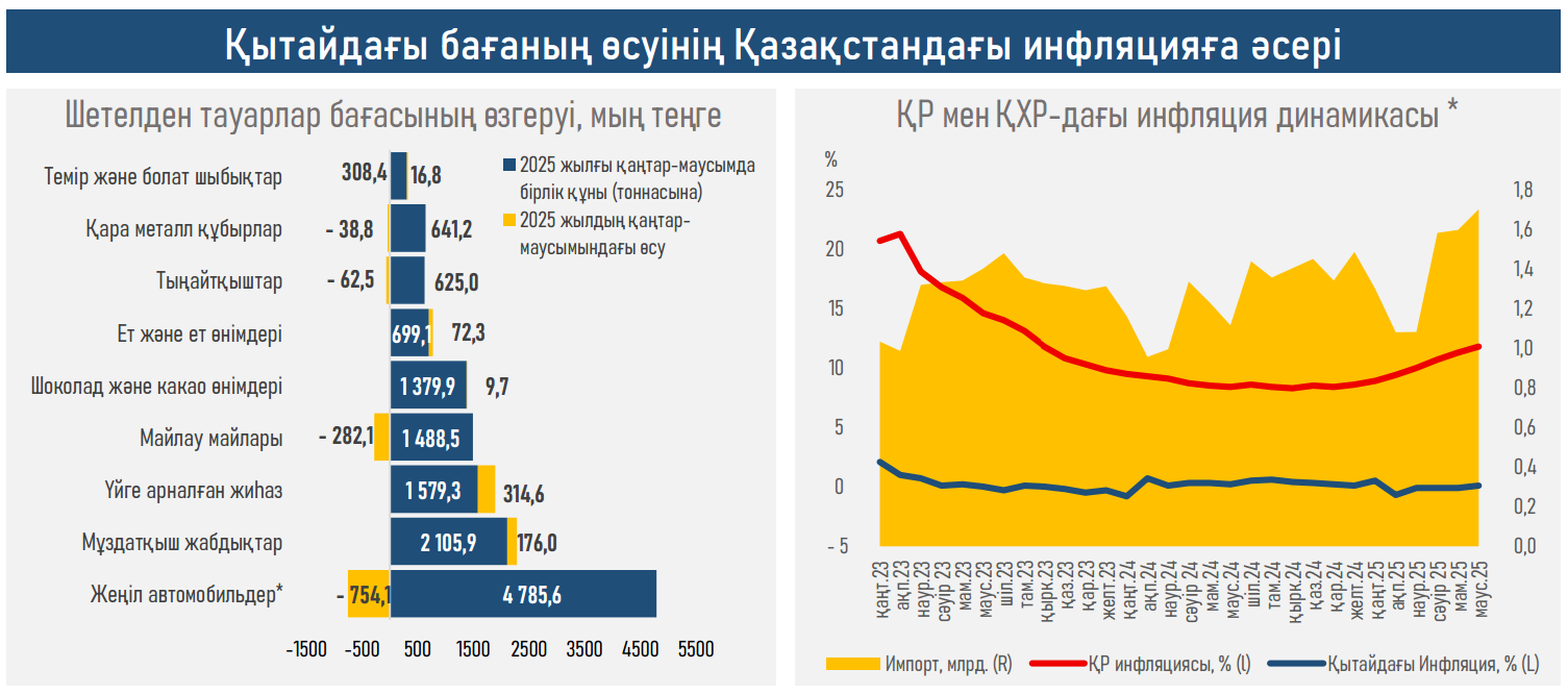 - Бұл ретте 6А25 ж. елдегі жылдық инфляция проинфляциялық факторлар (теңгенің әлсіреуі, Тарифтердің индекстелуі, фискалдық импульс) аясында 8,9%-дан 11,8%-ға дейін жеделдеді, ал Қытайдан импорт $6,8 млрд-тан $8,3 млрд-қа дейін өсті. ҚХР-дағы төмен инфляция (0,1%) импортты арзандатып, дезинфляциялық әсер етеді, бірақ ішкі проинфляциялық факторларды бейтараптандыру үшін жеткіліксіз.