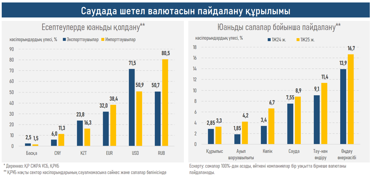 - Салалық тұрғыдан алғанда, юаньды ең көп пайдалану өңдеу өнеркәсібінде, тау-кен өндірісінде және саудада (төменде қараңыз) валюталық есептеулерді әртараптандыру, юаньдағы өтімділіктің өсуі (KASE-де CNYKZT жұбымен сауда көлемі 93%-ға өсті), компаниялардың транзакциялық шығындарды төмендетуге деген ұмтылысы аясында тіркеледі. Юаньмен есептеулердің кеңеюі бизнестің жаңа шындыққа практикалық бейімделуін көрсетеді, мұнда ҚХР-мен сауда валюталық артықшылықтардың параметрлерін белгілейді.