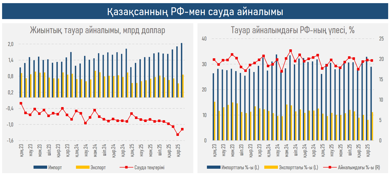 2025 жылдың қорытындысы бойынша Қазақстанның Ресеймен сауда қатынастары құрылымдық нашарлау фазасына өтті. Өзара тауар айналымының салыстырмалы түрде жоғары деңгейде ($27,4 млрд) сақталуына қарамастан, экспорт пен импорт арасындағы дисбаланс күшейіп келеді (дефицит $9,0 млрд-тан $11,1 млрд-қа дейін ұлғайды).