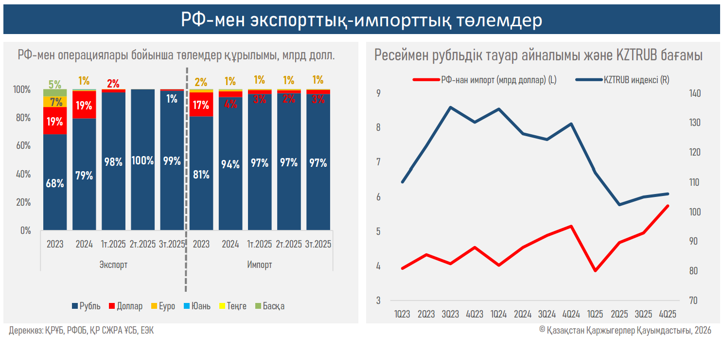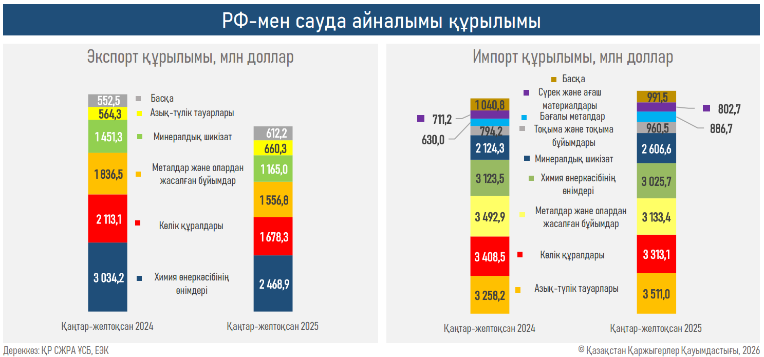 - Осылайша, 2025 жылдың қорытындысы бойынша Ресей Федерациясымен сауда қатынастары құрылымдық дисбаланстың тереңдеуімен және ресейлік тауарларға тәуелділіктің күшеюімен сипатталады.