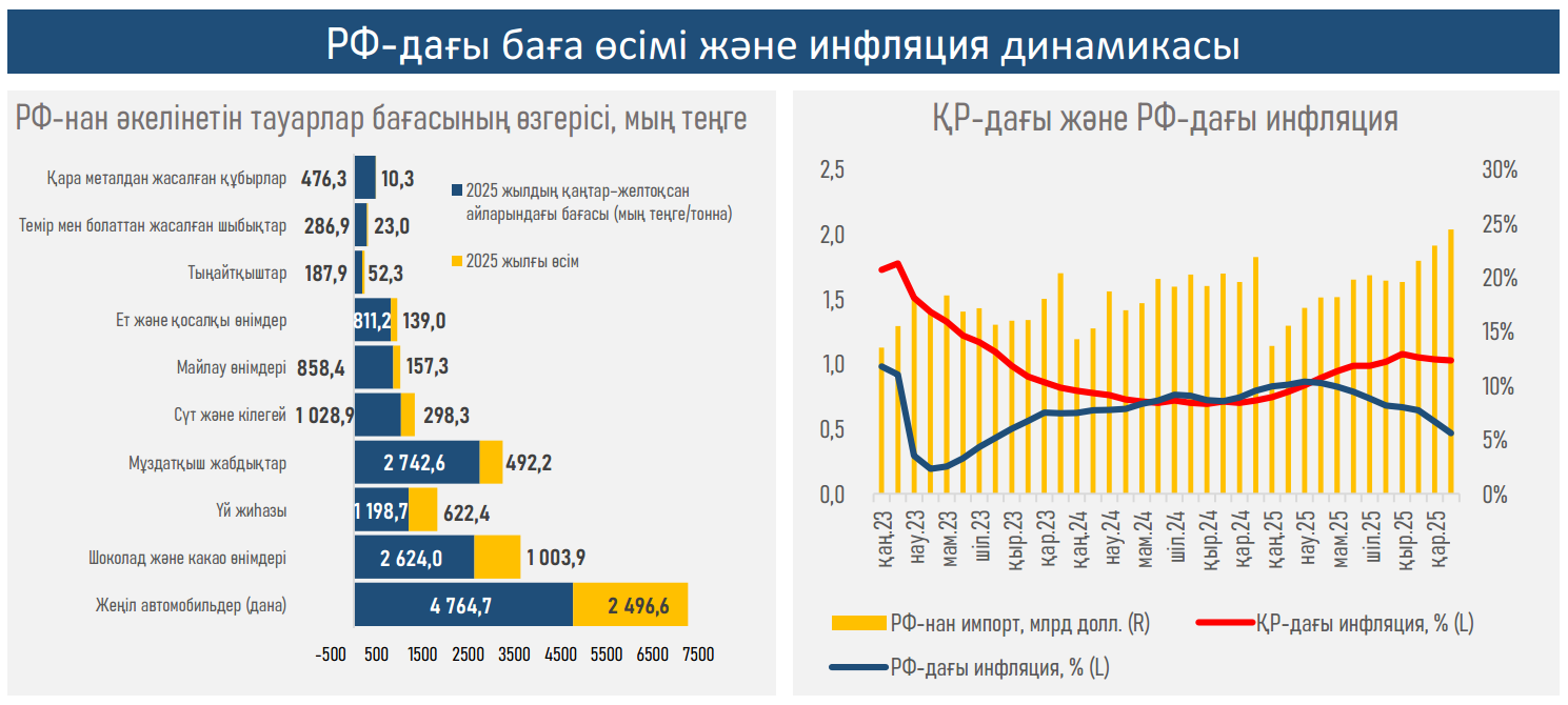- Қысқа мерзімді перспективада бұл дисбаланстар сақталуы ықтимал. Рубльдің теңгеге қатысты әлсіреуі (жыл басынан бері -6,5%) ресейлік тауарлардың бағалық басымдығын қамтамасыз етеді. Бұл ретте, экономиканы диверсификациялау және ішкі өндірісті дамыту бойынша шаралар іске асырылмаса, импортқа тәуелділік жоғары деңгейде қалып, сауда балансына, инфляцияға және валюта нарығына қысым көрсетуді жалғастырады.