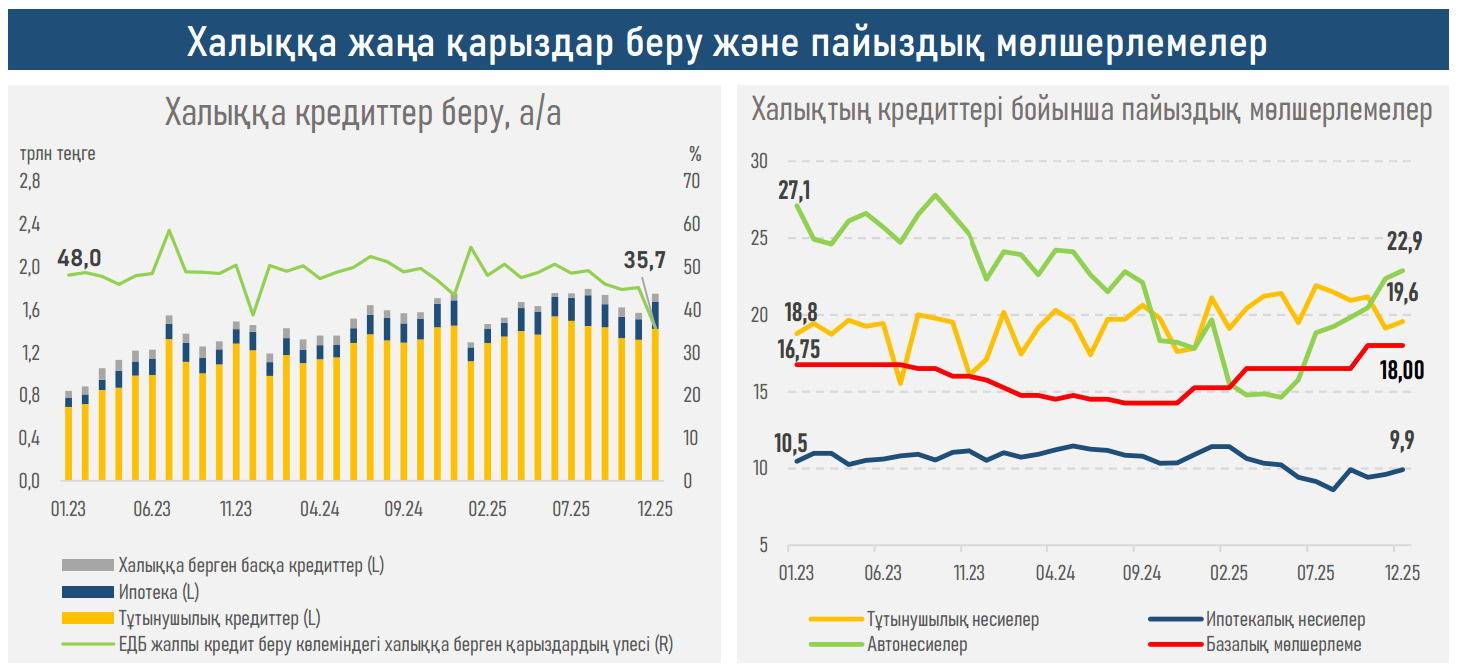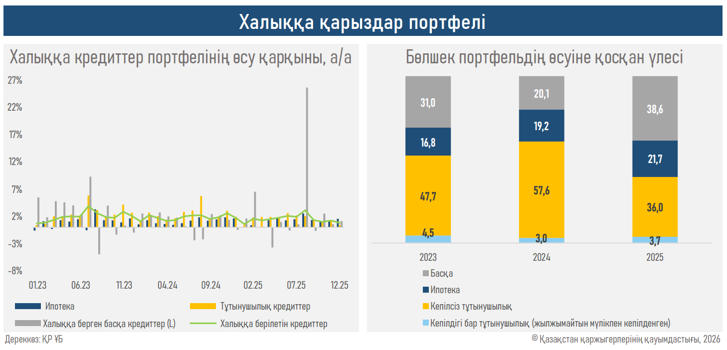 2026 жылдың басында нарық қазірдің өзінде түзету белгілерін көрсетіп отыр (қаңтар-ақпан айларында берілген қарыздар көлемі 5,9%-ға азайды). Ақша-несие шарттарының қатаң сақталуын және бұған дейін қабылданған реттеуші шаралардың әсерін ескере отырып, бөлшек несиелеудің одан әрі баяулауы күтіледі. Бұл үй шаруашылықтары шығыстарының неғұрлым тежелуіне және экономикалық динамикаға несиелік импульс үлесінің төмендеуіне ықпал етеді.