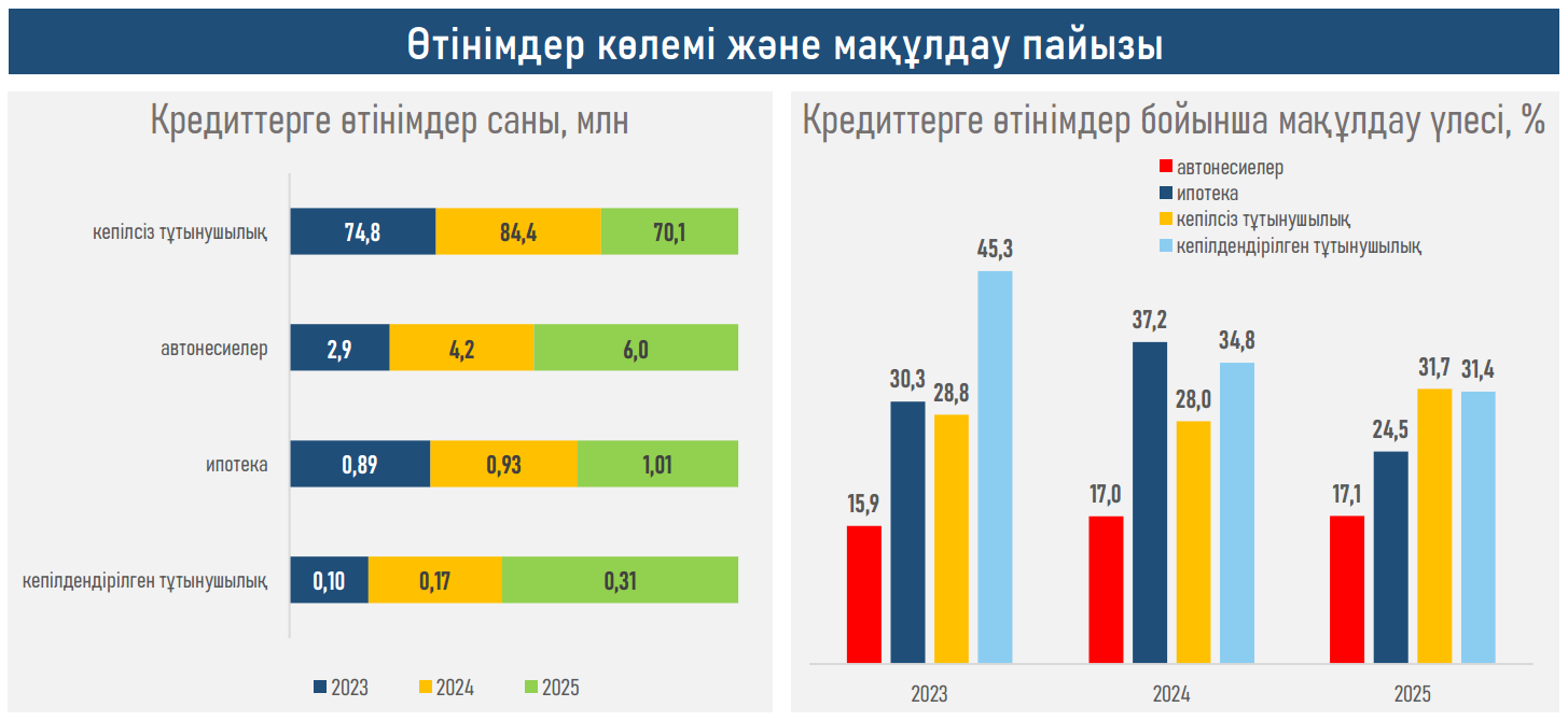 - 2025 жылы бөлшек несиелеу динамикасы халық тарапынан сұраныстың бәсеңдеуі аясында қалыптасты. Бұл төмендеу өтінімдердің негізгі үлесін (91%) құрайтын кепілсіз қарыздар сегментіндегі белсенділіктің құлдырауына (ж/ж -16,9%) байланысты болды.